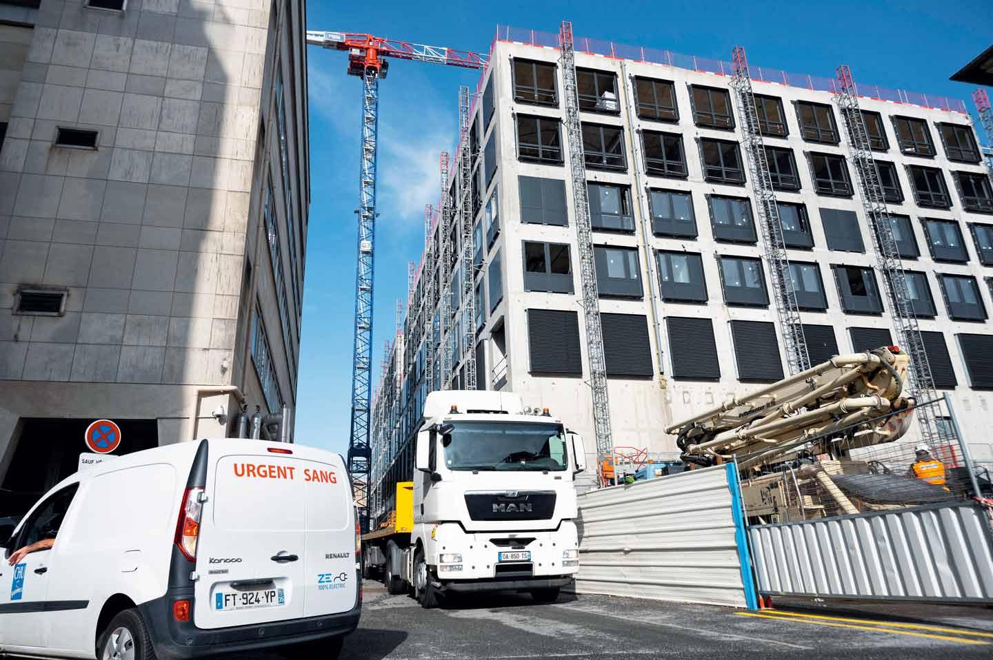 L’emprise du chantier se situe à la place d’un ancien bâtiment qui a été démoli et qui était relié à d’autres bâtiments par des galeries souterraines. D’où beaucoup de réseaux, y compris souterrains, à dévier, diverses circulations dévoyées, comme le déplacement des entrées des urgences ou certains cheminements piétons, la pose de clôtures… Dans un tel contexte, la sécurité au sens large était un impératif : celle des compagnons sur le chantier, mais aussi celle des personnels hospitaliers, des sous-traitants intervenant dans le cadre de l’activité hospitalière, des patients ainsi que du public.