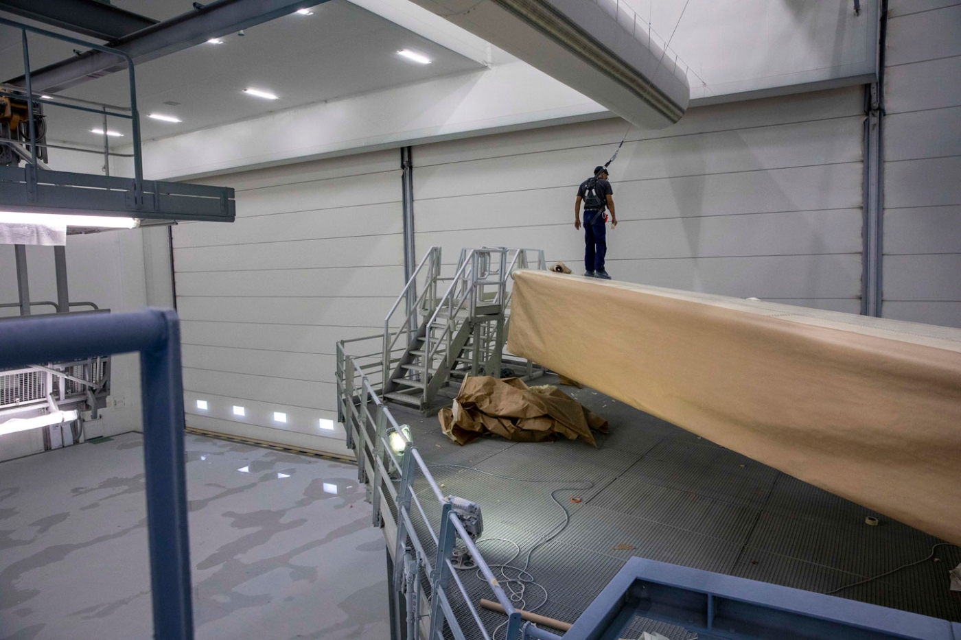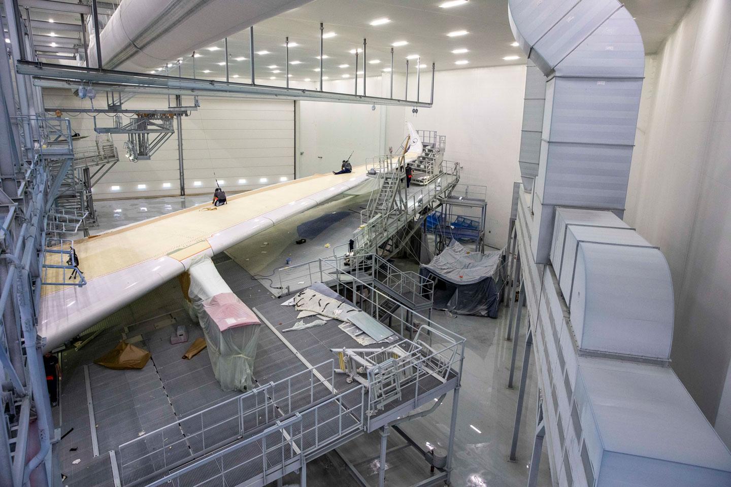 Pour l’heure, les opérateurs terminent le ponçage d’un mastodonte de 77 mètres de long, et plus de 40 d’envergure. Dans la vaste salle, un léger souffle est perceptible, témoignage d’un système de ventilation qui renouvelle entièrement l’air en 10 minutes. Le principe ? Une gaine textile microperforée, qui court au milieu du plafond tout le long de la salle, et deux imposantes centrales de ventilation installées de part et d’autre de l’appareil, au niveau des ailes, qui soufflent de l’air chaud aspiré par le bas, à travers des grilles aménagées dans le sol. « Il faut trouver le juste équilibre pour la vitesse car lorsqu’on applique plusieurs épaisseurs de peinture, si on envoie de l’air chaud trop vite, la surface risque de sécher et des bulles de dégazage peuvent se former dessous et créer des imperfections », indique Fabien Andral.