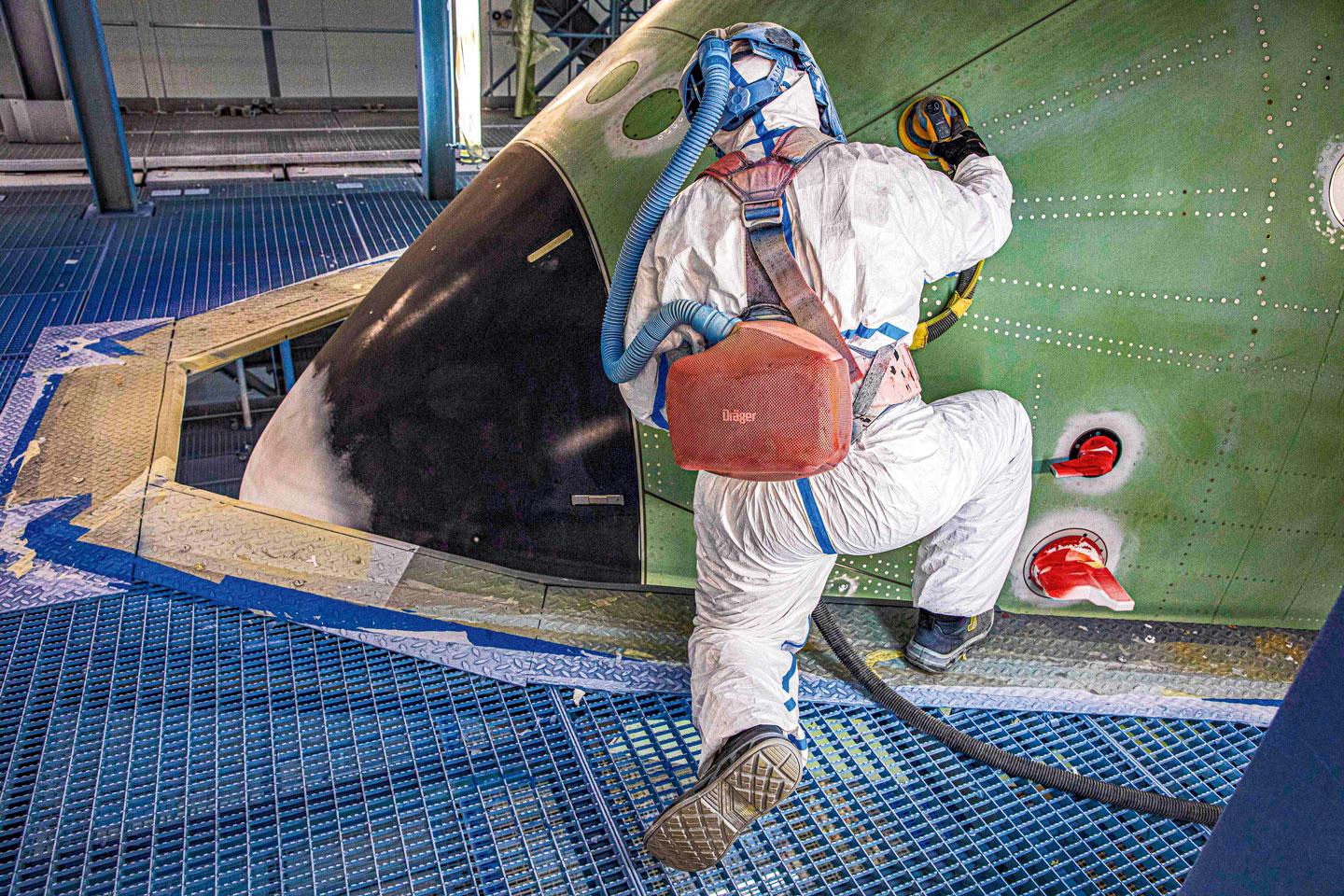 Une « mise en beauté » qui nécessite plusieurs étapes délicates. En premier lieu, l’avion est installé dans l’un des quatre hangars du site et encerclé d’imposants docks roulants, des plates-formes mobiles à garde-corps, capables d’atteindre une vingtaine de mètres de haut et de s’approcher à 20 cm du fuselage. La première phase consiste à poncer manuellement la surface de l’appareil, de manière à égrener la sous-couche, avant l’application de la peinture : d’abord une couche primaire, ocre, puis le plus souvent une blanche, suivie de diverses couleurs pour les écritures, le contour des hublots… et enfin le vernis. Entre ces différentes opérations, les salariés s’attellent à masquer et démasquer, à l’aide d’adhésif et de papier kraft, les zones de l’aéronef qui ne doivent pas être peintes. « C’est ce qui prend le plus de temps, confie le directeur général, Fabien Andral. Avec la ventilation, lorsque vous peignez au pistolet électrostatique, cela crée un nuage qui risque de polluer les surfaces à proximité. »
