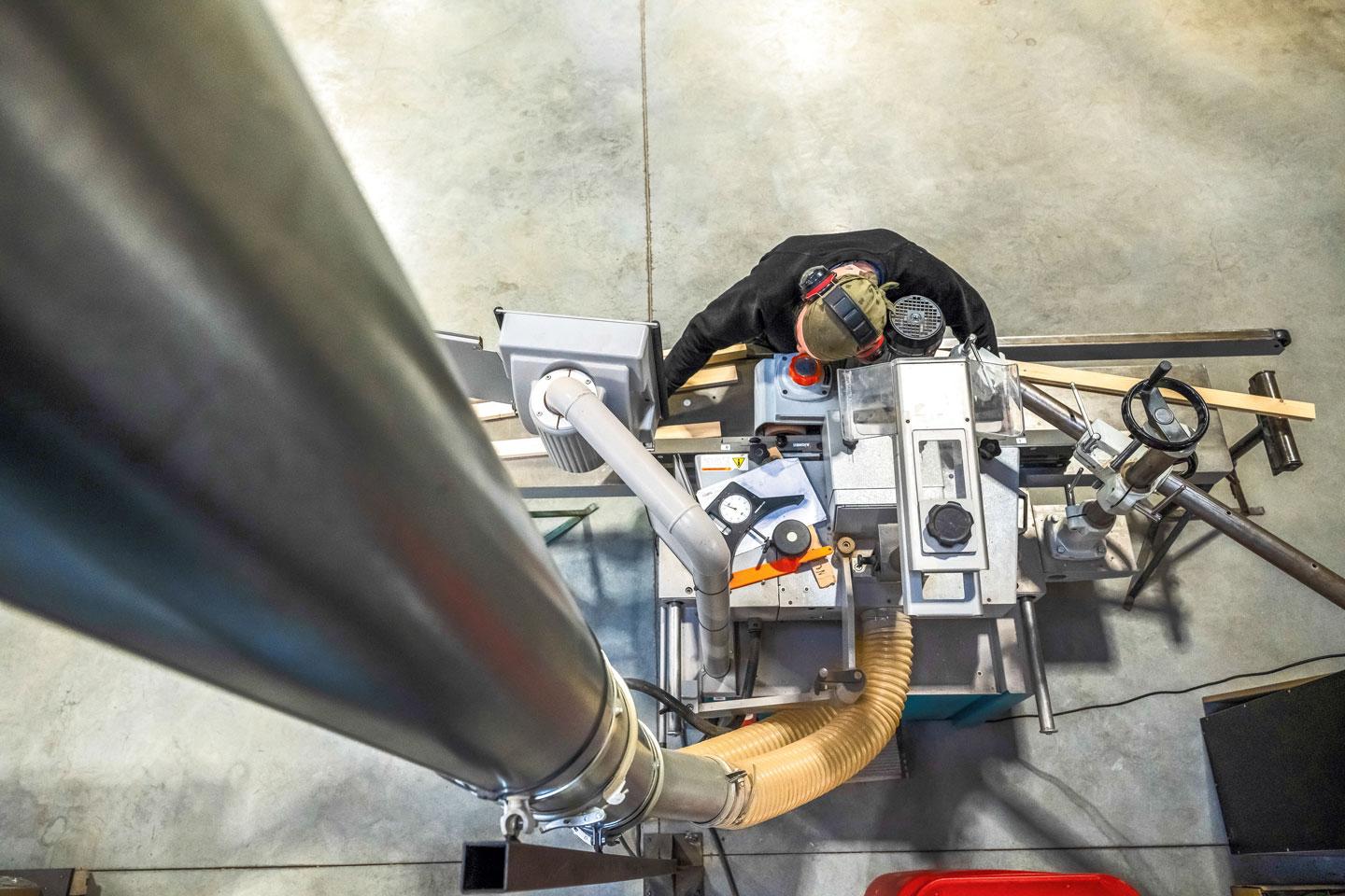 Le filtre de l’aspiration a été installé en extérieur, pour préserver l’équipe du bruit et ne pas empiéter sur l’espace de travail intérieur. Deux brides sont déjà prévues pour y brancher ultérieurement un système d’aspiration des plus fines particules en suspension en cours de développement. Une des particularités est qu’il s’agit d’une installation d’occasion, rachetée à une menuiserie bretonne qui avait fermé. « On peut avoir de la bonne qualité d’occasion au prix de la mauvaise qualité neuve », estime encore Jean Malingrey, ingénieur de formation qui n’a pas peur de faire réviser ou réparer certaines parties mobiles pour garantir le bon fonctionnement des équipements. Ici, la mezzanine, le robot aspirateur, les luminaires, les radiants au plafond… pour n’en citer que quelques-uns, sont de seconde main.
