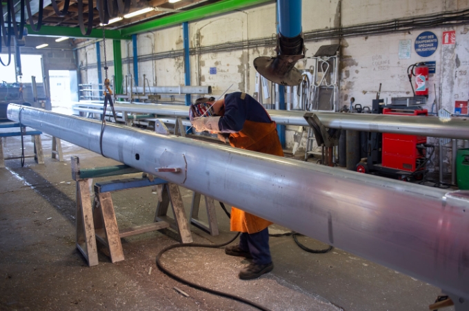 Une fois cette étape terminée, les éléments sont sortis à l’aide de palans, puis intègrent le bâtiment voisin, cette fois sur des chariots qui les transportent jusqu’aux postes de soudage. Là, trois soudeurs réalisent des soudages TIG alu avec gaz argon, jusqu’à 5 heures par jour. Les pièces passent ensuite dans une série de bains visant à les dégraisser, décaper, blanchir, anodiser, colmater à chaud puis à froid... Elles seront ensuite contrôlées et emballées pour partir à La Rochelle.
