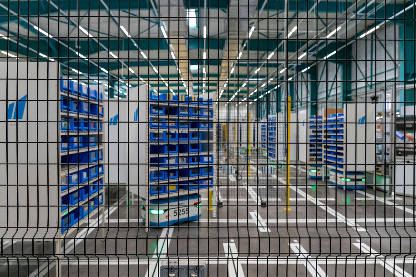 Les automates ainsi implantés sont petits, mais costauds : ils mesurent 1 m de long sur 65 cm de large et 45 cm de hauteur et sont capables de porter jusqu’à 600 kg. Grâce à leurs capteurs, ils évoluent dans un espace délimité par des panneaux grillagés, en suivant un quadrillage au sol, pour déplacer les étagères garnies de références jusqu’aux opérateurs. « Concernant le risque machine, l’enceinte, qui isole les robots, associée à des barrières immatérielles aux postes de préparation de commandes, nous a semblé pertinente, indique Christophe Valla. En plus, le dispositif est silencieux par rapport aux solutions avec convoyeurs et jets d’air comprimé pour propulser les boîtes qui nécessitent le port de bouchons d’oreilles. »