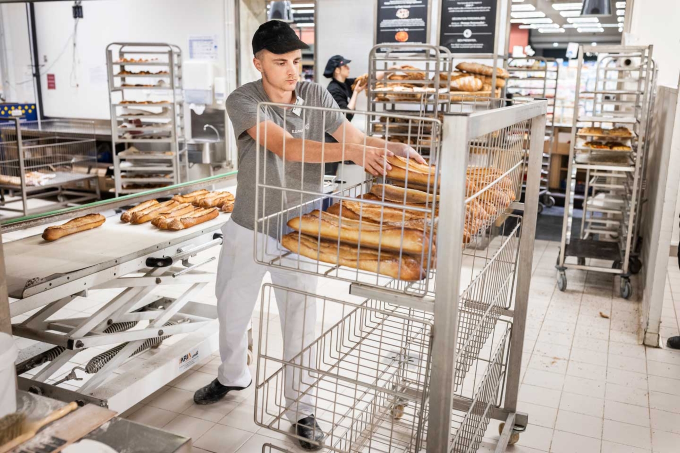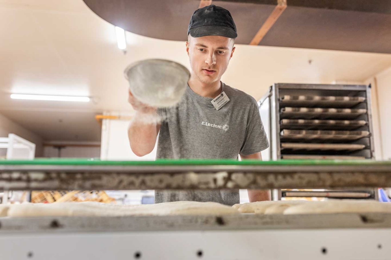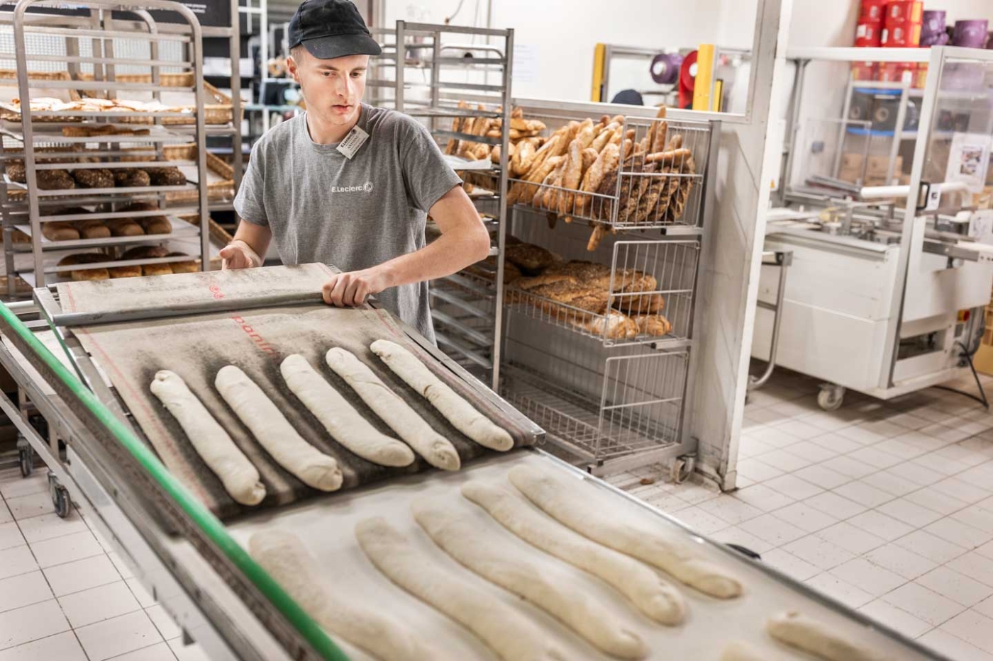 Le premier boulanger arrive à 3 h 15. « Tous les jours, on sort 1 000 à 1 200 baguettes tradition et 65 sortes de pains faits sur place. Les gens en ont rarement conscience quand on leur parle de grande distribution », souligne Raphael Roméro, boulanger adjoint. À lui seul, le secteur boulangerie-pâtisserie de l’hypermarché E. Leclerc de Saint-Paul-lès-Dax, dans les Landes, regroupe une vingtaine de personnes. Au total, il y a 380 salariés dans le magasin, pour 7 900 m2 de surface commerciale. Et si l’ouverture des portes aux clients a lieu à 8 h 30, beaucoup prennent leur poste bien plus tôt, exerçant des métiers dans lesquels les tâches répétitives et physiques sont légion.