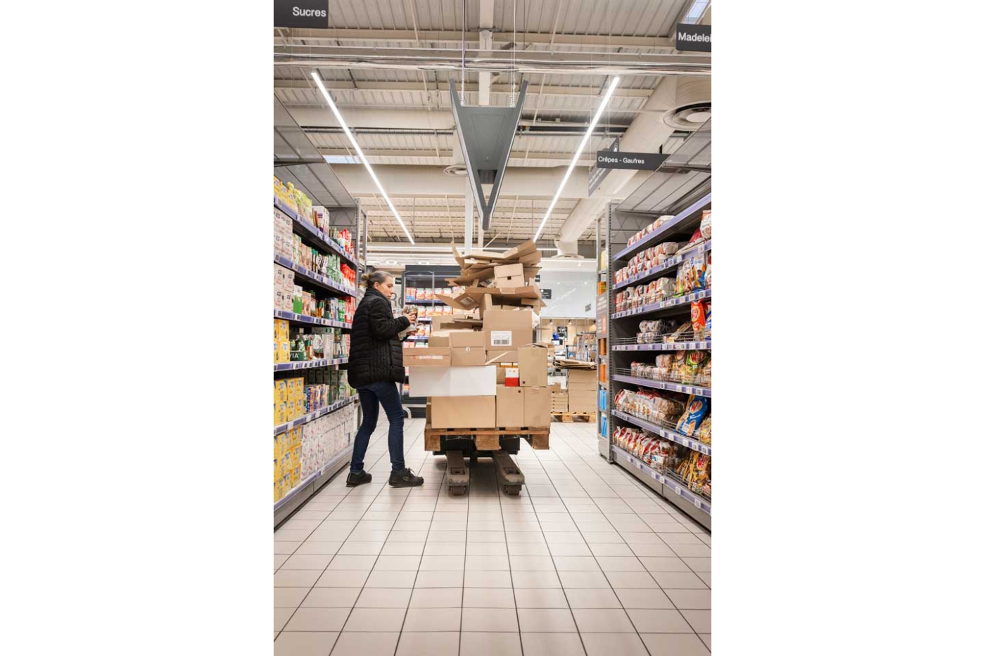 En complément, des équipements de mise en rayon (Émer), qui comportent à la fois un moyen de déplacement, un moyen d’immobilisation et un moyen d’accès sécurisé à une plate-forme, sont fournis en nombre. Certains sont dotés d’une desserte intégrée. « Cette tablette est bien pratique pour poser les produits », affirme Alexia Buleta, en pleine opération de « facing » au rayon frais, une tâche qui consiste à repositionner les produits situés à l’arrière vers l’avant. « Nous avons aussi des dispositifs qui ramènent automatiquement le produit en façade, tandis que le remplissage continue à se faire par l’avant. C’est très pratique au rayon boissons », évoque pour sa part Éric Réveillon, un autre employé. Pour d’autres tâches, des chariots à niveau constant sont également utilisés.