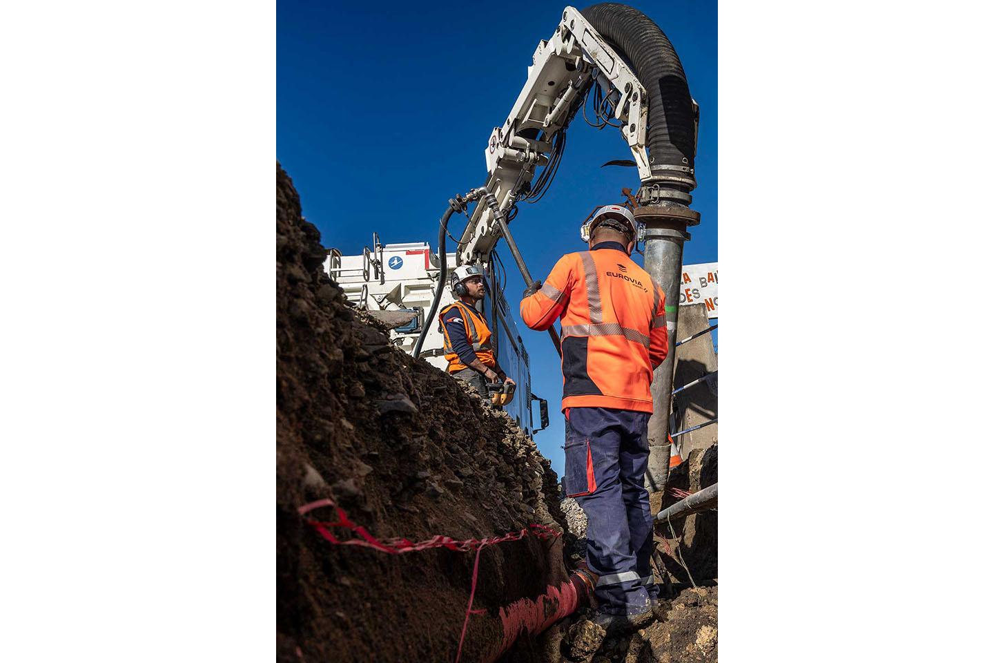 Après avoir contourné la place Joseph-Gardet, nous nous rendons dans une rue dont la circulation a été alternée. L’un des trottoirs a été éventré pour y faire passer de nouveaux réseaux : six pour les télécoms, un pour l’arrosage et deux autres pour l’électricité. À l’intérieur de la tranchée, Wesley Moefana, un ouvrier d’Eurovia, guide et aide, manuellement, à la pelle, le conducteur de l’entreprise Tapir (Terrassement par aspiration pour intervention réseau). « Nous avons loué les services de cette entreprise pour la semaine, car le trottoir est très étroit et nous avons identifié la présence d’au moins six réseaux sensibles », explique Guillaume Raynaud. Une décision approuvée par le contrôleur de sécurité.