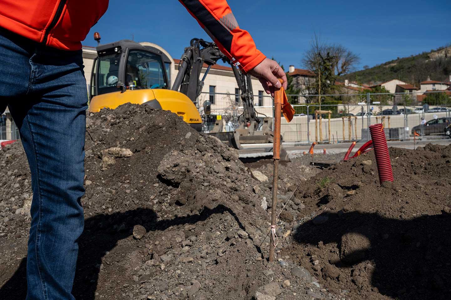 « La place Joseph-Gardet est un ancien champ de foire, explique Guillaume Raynaud, conducteur de travaux chez Eurovia. Je pense que cela fait très longtemps qu’il n’y avait pas eu de travaux conséquents, avec une bonne cartographie des réseaux. » Les traits de bombes de couleurs au sol sont partout : vert pour les télécoms, rouge pour l’électricité, jaune pour le gaz. « Vous voyez, poursuit Guillaume Raynaud, quand on met ce V de part et d’autre du trait pour signaler le réseau, cela signifie que nous avons cette distance d'incertitude. Ici, je dirais que nous avons 50 cm de part et d’autre. »