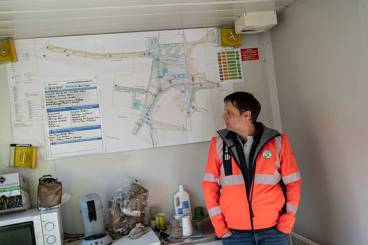 Guillaume Raynaud a bien conscience des risques encourus. Chaque matin, son chef de chantier organise « Les 5 premières minutes » pour l’ensemble de l’équipe, même si tous ont été formés à l’AIPR (autorisation à intervenir à proximité des réseaux). « On essaie de faire participer chacun le plus possible, pour que tous prennent bien conscience des risques, explique le conducteur de travaux. Même si nous sommes une petite équipe d’une dizaine de personnes, c’est important. On ne cesse de dire que même s’il n’y a pas de filet (censé identifier et protéger les réseaux), cela ne veut pas dire qu’il n’y a pas de réseau. » Dans le bungalow de chantier, à côté du plan de la place commenté chaque matin, sont affichés les interventions du jour, les sous-traitants présents ainsi que les neuf règles d’or d’Eurovia, issues entre autres des « Safety Days » du groupe, et auxquelles il n’est pas question de déroger sous peine de sanction immédiate.