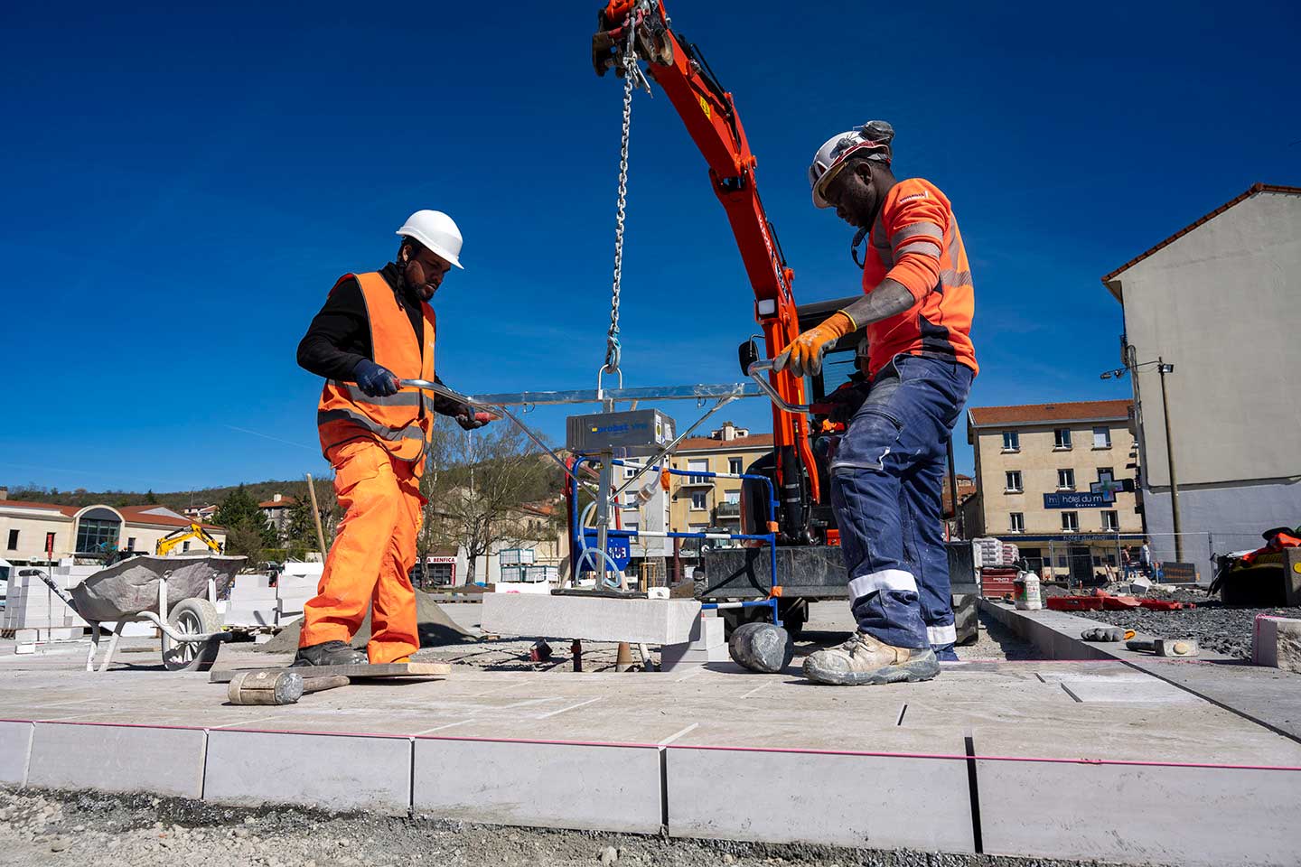 Sur une partie de la place, les opérations de pavage ont commencé. Elles sont réalisées par une équipe de Filippis, filiale régionale d’Eurovia. Pour ce faire, les ouvriers ont enfoncé un peu partout des fiches d’altimétrie, afin d’avoir des repères pour le pavage. « Mais pour ne pas prendre de risques si la fiche touche un réseau, le haut des fiches est isolé avec un embout en plastique », remarque Christophe Degeorge, le contrôleur de sécurité de la Carsat Auvergne. De plus, toujours dans une démarche de prévention des risques professionnels, la pose des plus grosses dalles (qui atteignent 59 kg) se fait à l’aide d’un préhenseur à ventouse, acquis pour ce chantier, évitant aux ouvriers paveurs des ports de charge qui peuvent être conséquents.