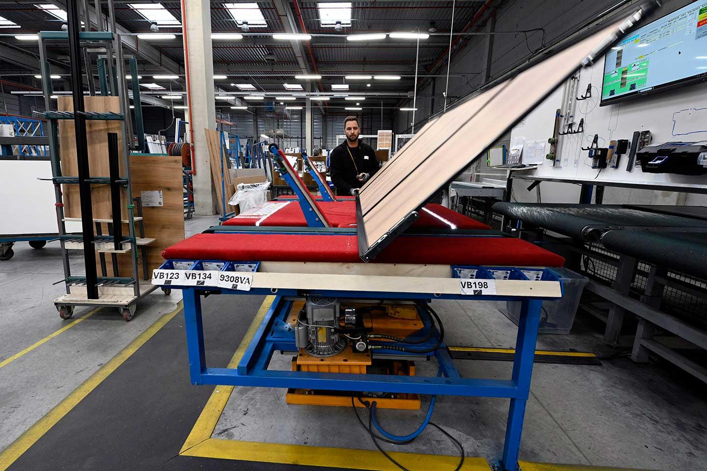 Une fois revenu devant l’Ergotable, Geoffrey Bessy s’attelle rapidement au montage. Plus besoin de tourner plusieurs fois autour de la table pour chercher de la quincaillerie, ou avoir des gestes contraignants. Télécommande autour du cou, le monteur peut élever la table, la faire tourner sur elle-même, tandis que lui reste à proximité de la quincaillerie dont il a besoin. Cela permet de diviser le temps de manutention quotidien par 10. Une fois le montage terminé, l’opérateur déclenche les bras qui retournent la porte en douceur. Il n’a plus qu’à coller l’étiquette d’identification sur la face visible – une demande du service commercial.