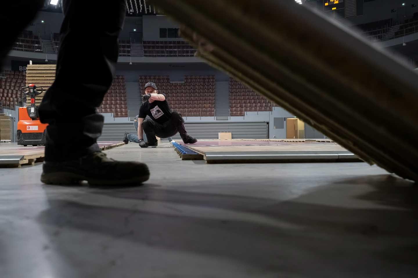 La zone technique est dotée d’une rampe vers l’extérieur pour accueillir les livraisons – de sorte que le déchargement se fait à couvert –, ainsi que d’une ouverture donnant dans la salle, suffisamment haute et large pour laisser passer un camion si besoin. Deux autres espaces de stockage sont aménagés aux angles de la salle, limitant ainsi la distance de transport du matériel. En l’occurrence, quelque 700 plaques de parquet à emboîter, selon une combinaison bien précise, pour respecter les motifs formés par le marquage au sol. Pour ce faire, le rangement a été optimisé en tenant compte de l’ordre d’installation. Avant le début du montage, les racks d’une vingtaine de plaques sont alignés un à un sur le bord du terrain grâce à des transpalettes électriques, pour éviter les allers-retours pendant l’opération.