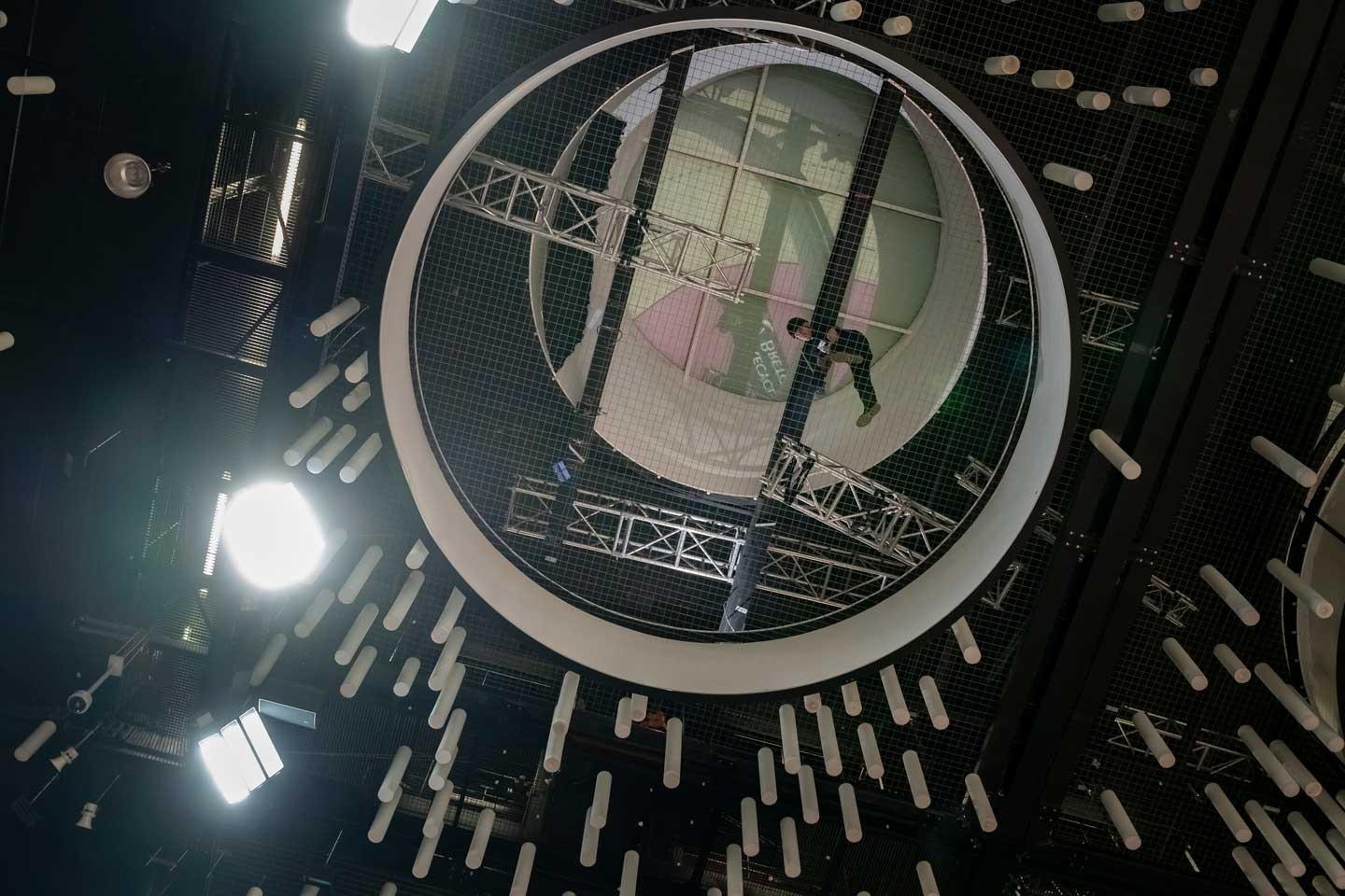 Reste à régler les projecteurs, descendre l’imposant cube d’écrans géants, décrocher les rideaux occultants utilisés lors du précédent spectacle pour masquer les abords de la scène… Pour toutes ces tâches, direction le gril, à 17 mètres de hauteur. Cet espace de travail, pourvu d’un ensemble de câbles et de poulies couvrant toute la surface de la salle, est accessible par un ascenseur. À l’entrée, une affiche rappelle qu’il faut vider ses poches dans le panier dédié, pour éviter les chutes d’objet sur les techniciens au sol. Puis, grâce à des passerelles protégées de garde-corps, les techniciens, casque sur la tête, accèdent aux différentes zones où ils doivent intervenir. Entre les passerelles, un grillage métallique, tendu au-dessus du terrain, leur permet de travailler en sécurité, sans redouter les chutes. « Dans la plupart des salles de spectacle, il faut se munir d’un harnais, s’accrocher, se mouvoir sur les poutres, voire descendre en rappel… Là c’est sécurisé et confortable », se réjouit Guillaume Gatius, un électricien.
