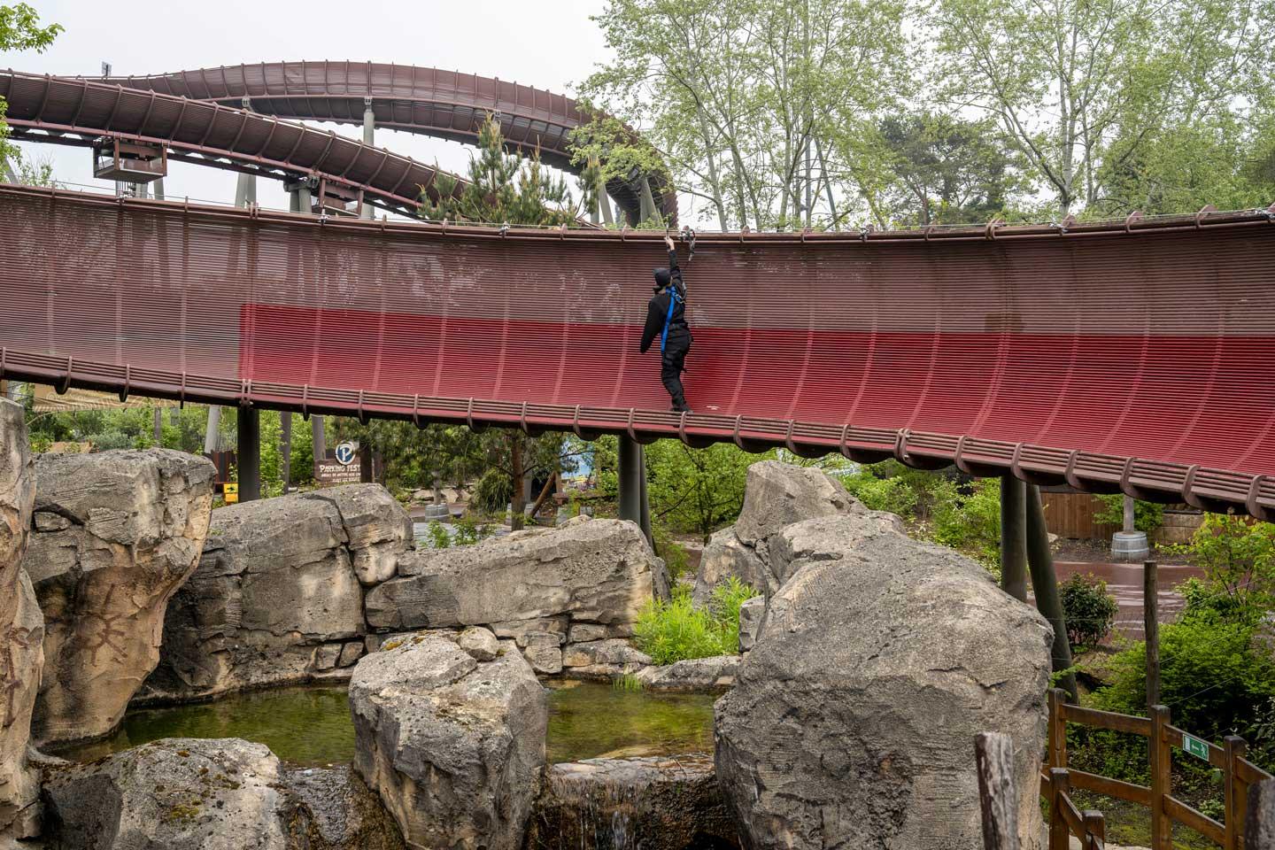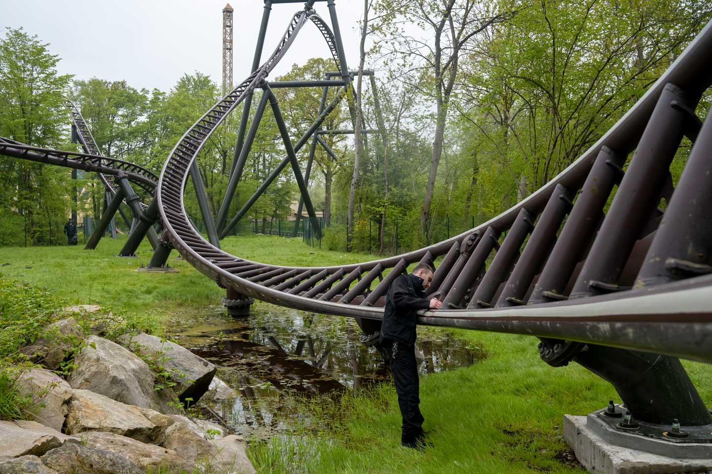 Les neuf embarcations vérifiées, les hommes partent en direction de Toutatis, un roller coaster mis en service en 2023, dont le wagon est propulsé à 110 km/h par un lanceur électromagnétique. Sur le trajet, on aperçoit la Trace du Hourra, circuit de bobsleigh géant, datant de 2001, qu’une technicienne est en train d’arpenter, sécurisée par un harnais. « Des lignes de vie ont été aménagées récemment sur tous les tronçons en dévers pour limiter le risque de chutes de hauteur », rappelle Pierre Emo.