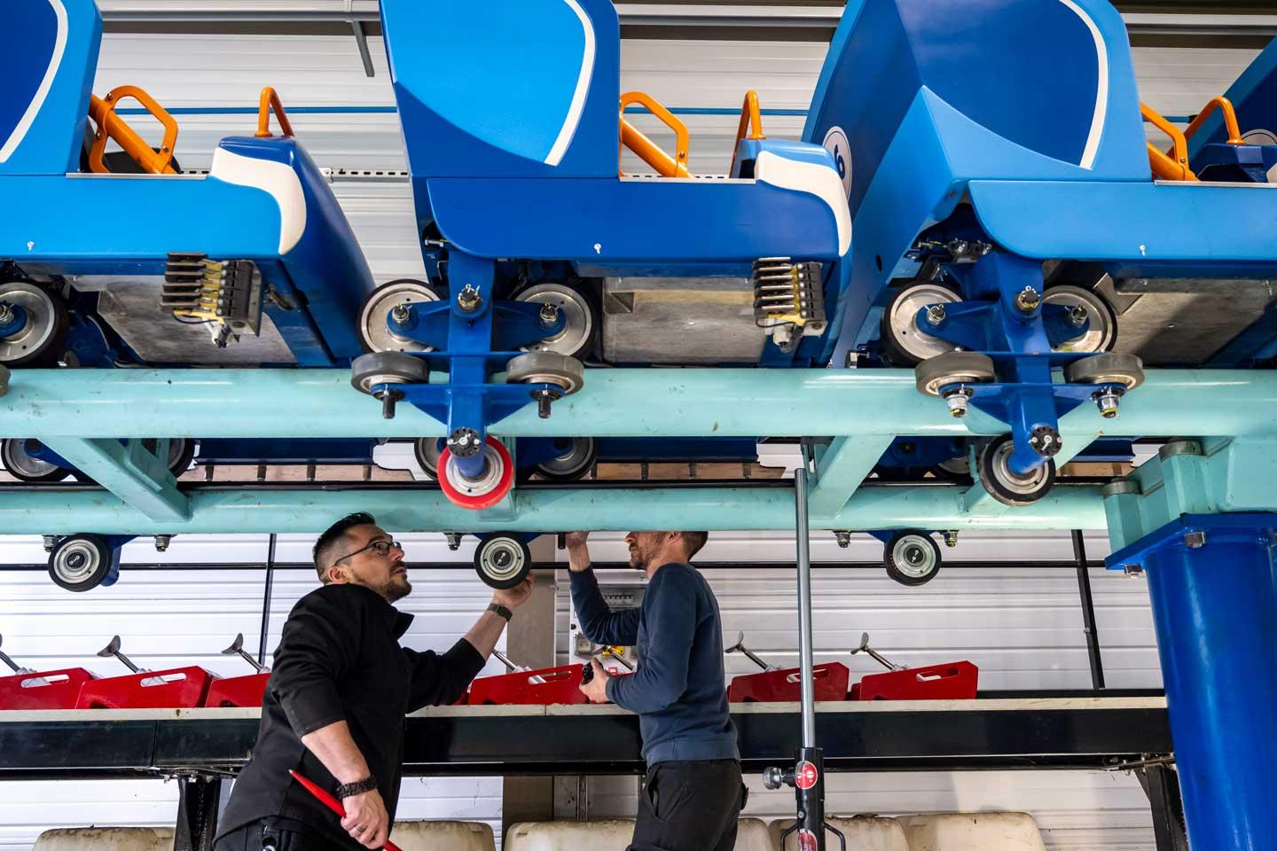 Pendant ce temps, les wagons de 20 passagers subissent leurs contrôles hebdomadaires : centrage, graissage, vérification des harnais de sécurité... Un système automatisé permet de déplacer le tronçon de rails sur lequel repose le train et de le transférer directement dans un atelier situé à quelques mètres de la gare de Toutatis. À l’intérieur, les techniciens disposent d’un escalier et d’une passerelle sécurisée pour accéder aux sièges. Ils peuvent se déplacer facilement sous la structure pour atteindre, debout, les pièces à vérifier. Là encore, le confort des salariés s’est amélioré avec le temps. « Dans les premiers ateliers, ils travaillaient dans des fosses », se remémore Antoine Lardière.