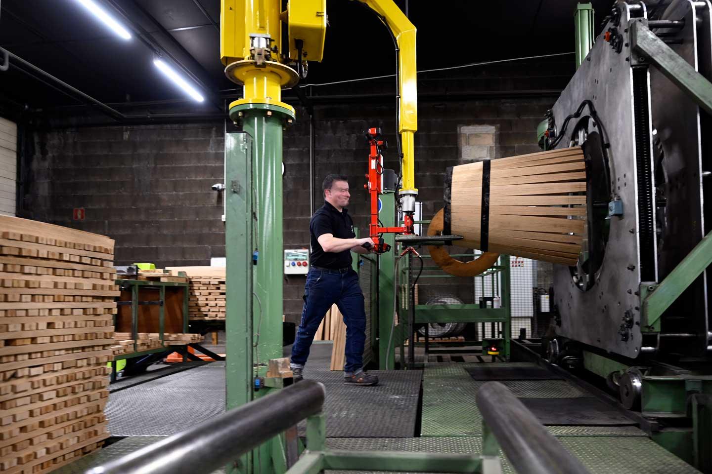 Lorsque le séchage sur parc est terminé, les merrains sont coupés à la bonne longueur pour constituer des douelles, ces pièces de bois formant les tonneaux. Jean-Christophe Sercy, tonnelier, déplace les palettes à l’aide d’un transpalette à haute levée électrique. « Ils remplacent progressivement les anciens, remarque Jean-Claude Bouteiller, contrôleur de sécurité de sécurité à la Carsat Bourgogne-Franche-Comté. Ici, dès que l’on soulève un sujet lié à la prévention des risques professionnels, la direction s’en empare pour trouver des solutions. »