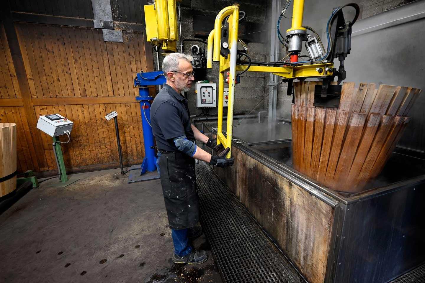 Les roses sont ensuite immergées 20 minutes dans l’eau bouillante, pour assouplir les bois et en extraire les tanins les plus agressifs. Afin de manipuler les tonneaux lors de cette phase d’immersion, le tonnelier dispose d’un bras manipulateur réalisé sur mesure. Pour fixer ensuite le cintrage, le tonneau subit une cuisson de 40 minutes, placé au-dessus d’une « chaufferette » alimentée par les chutes de bois. Au-dessus des postes de chauffe, est indiquée la température du bois.