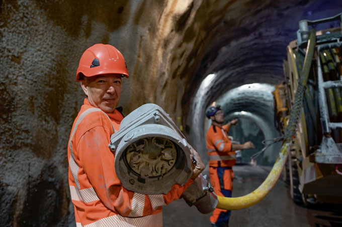 C’est pourquoi, depuis l’entrée du tronçon, et sur toute la longueur des deux tubes en cours de creusement, soit 1 921 mètres le jour de notre venue, deux gaines, une bleue et une jaune, courent au plafond des deux galeries. « Le creusement à l’explosif est un procédé très émissif en poussières, qui nécessite une ventilation dédiée et des moyens annexes tels que de la brumisation, explique Pascal Sergi, ingénieur-conseil BTP à la Carsat Rhône-Alpes. On peut y rencontrer divers autres polluants : les gaz issus des moteurs diesel des engins, ceux issus des terrains comme du méthane et du sulfure d’hydrogène, des fragments de clivage issus du broyage de roches, etc. Même s’il peut y avoir des débats sur les limites entre travaux souterrains et espaces confinés, le fait de travailler à de telles profondeurs et dans de telles conditions est assimilable à un milieu confiné. »