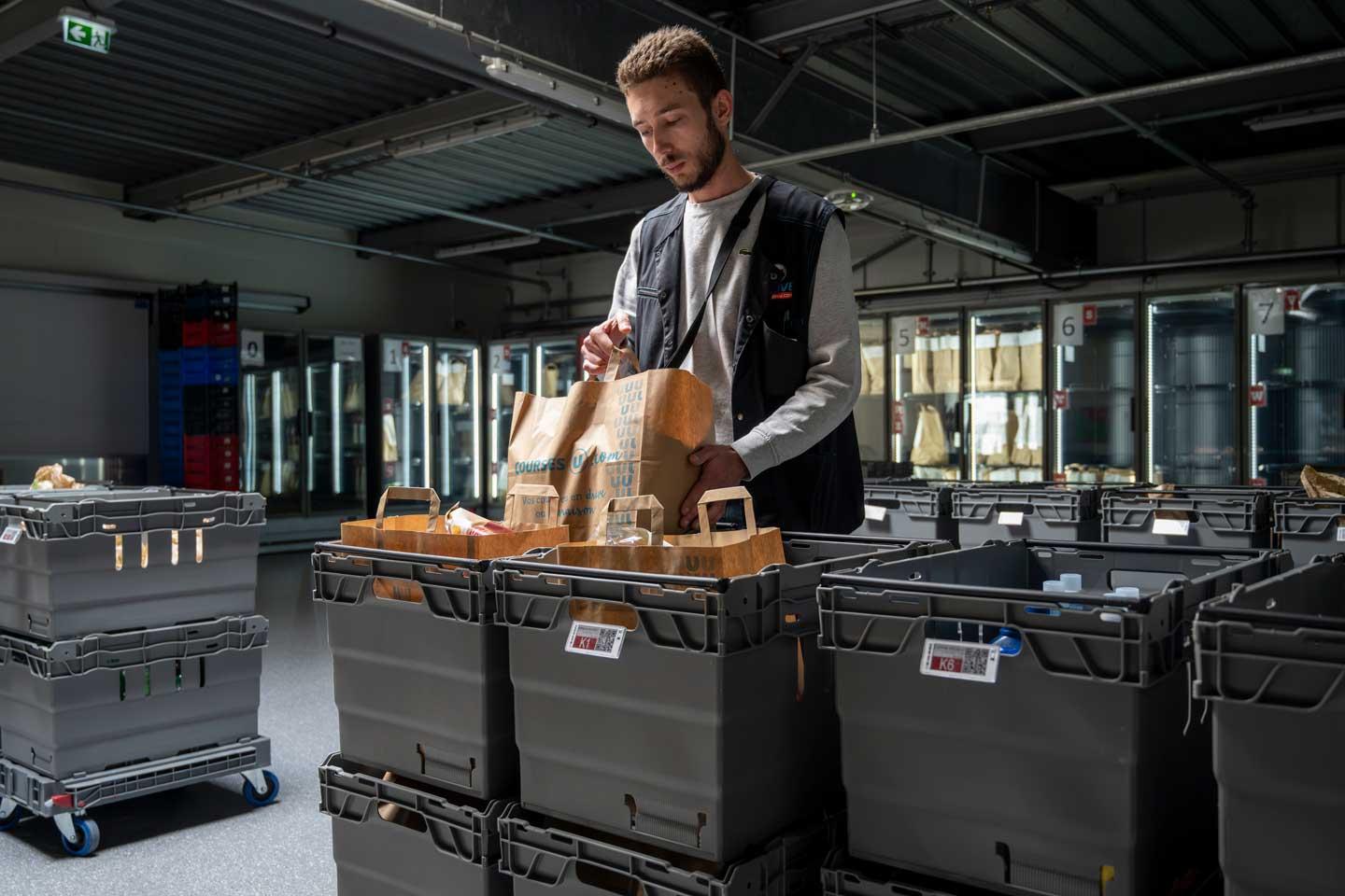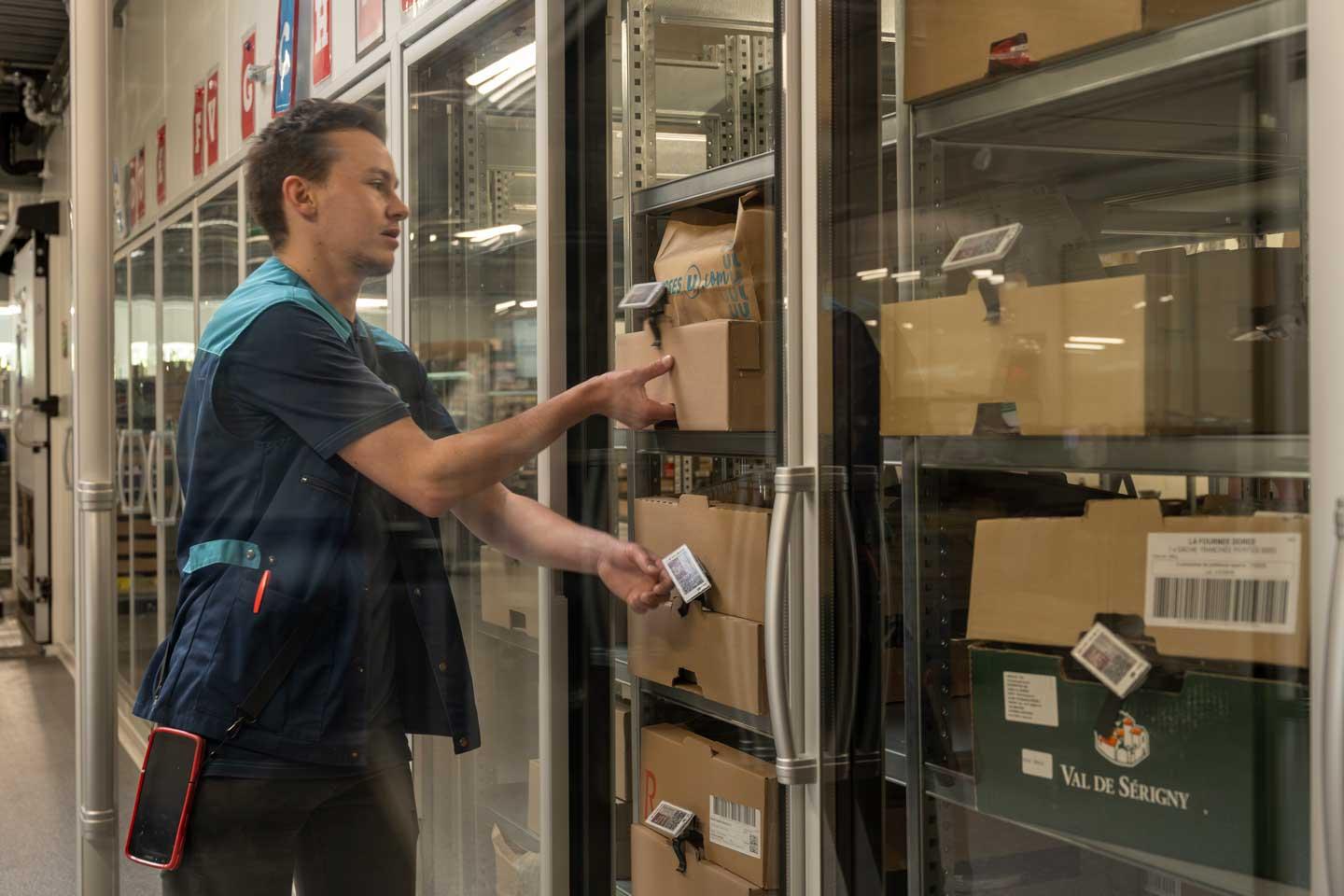 Ces derniers se garent à côté de bornes qui leur permettent de signaler leur arrivée. Les remiseurs sont ainsi prévenus et réunissent les différents éléments de la commande (frais, sec, surgelé), en s’aidant des étiquettes clignotantes et de leurs tablettes, avant de les apporter jusqu’au véhicule à l’abri sous un préau. « Les clients attendent trois minutes contre dix à quinze auparavant, car il était parfois compliqué de retrouver puis de récupérer le bon chariot dans l’espace réduit de l’ancien drive. Il m’arrivait de donner un coup de main pendant les rushs, j’avais donc conscience du stress engendré par l’organisation de l’époque, loin d’être optimale », souligne Henri Fouché.