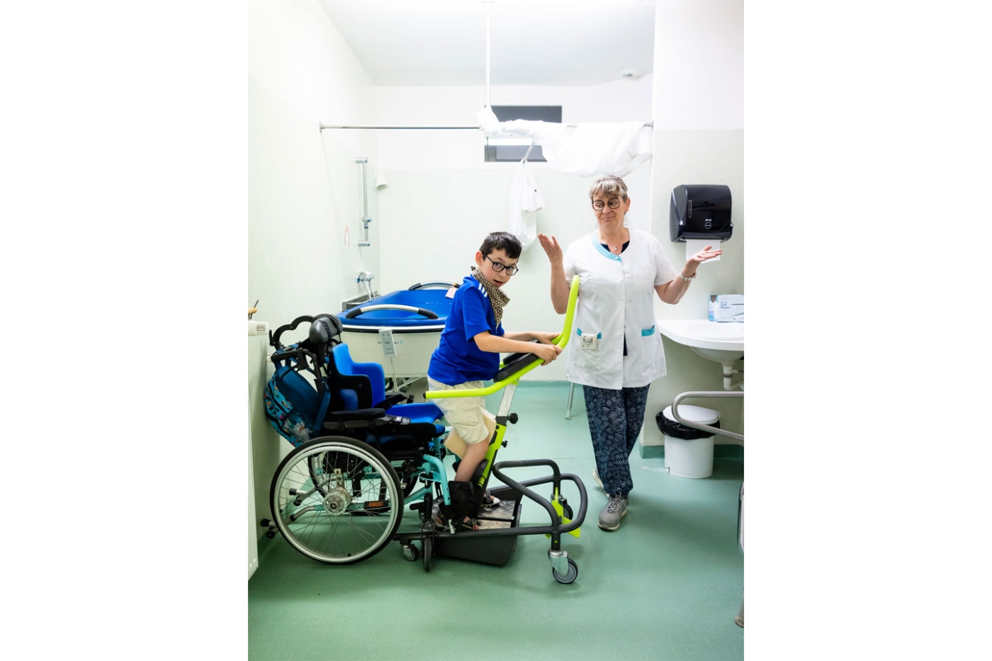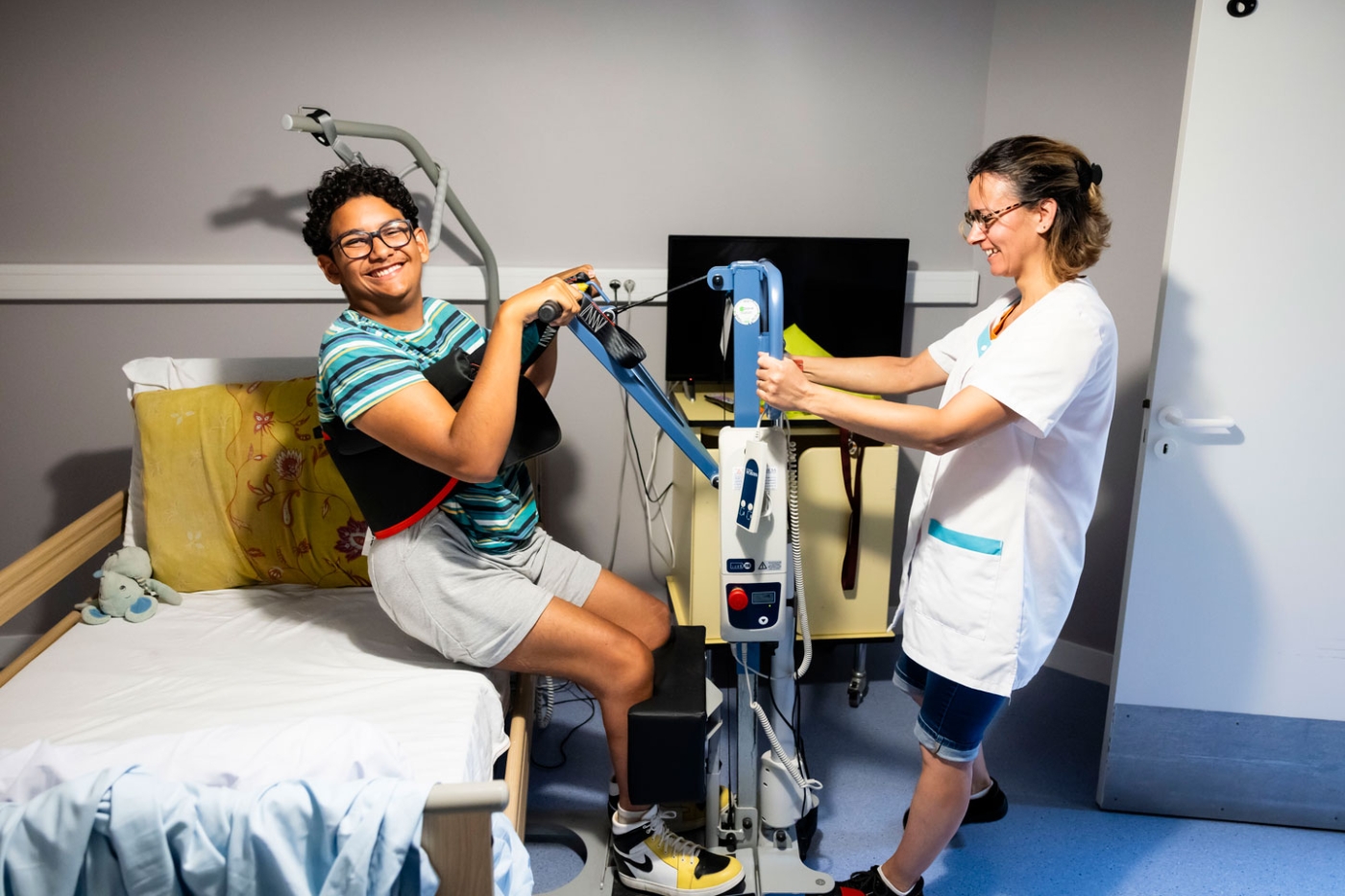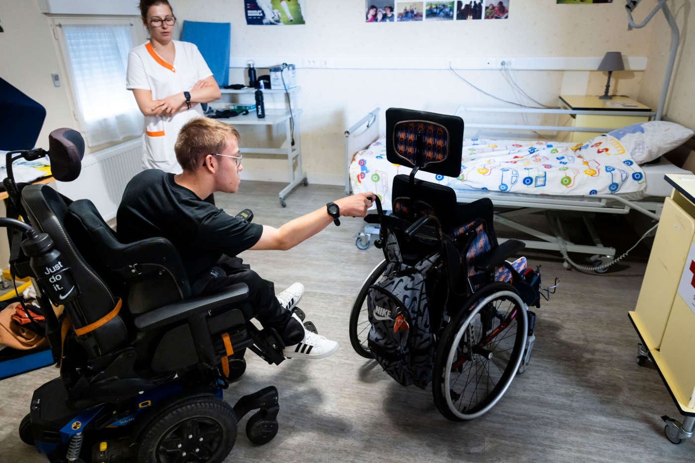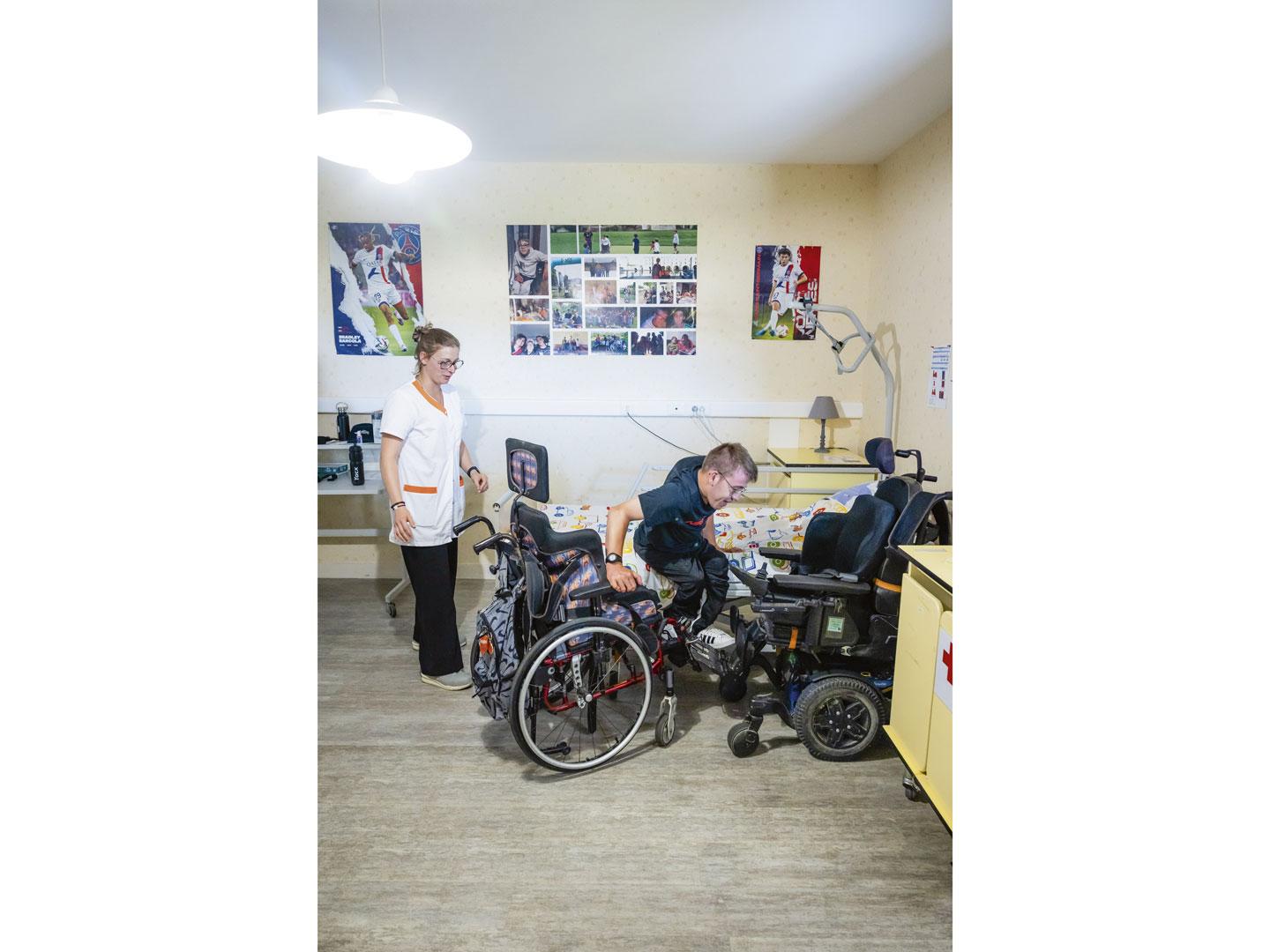 De l’autre côté du couloir, son copain Eliott souhaitait pouvoir lui-même passer du fauteuil électrique au fauteuil manuel avec lequel il joue à la boccia - un sport de boules proche de la pétanque pratiqué par les personnes en situation de handicap en catégorie handisport. Les professionnels ont réaménagé la chambre afin de lui laisser de l’espace pour effectuer seul ce transfert en passant par le lit. Assis sur ce dernier, il déplace son coussin d’un fauteuil à l’autre. Chaque situation est unique. « Dans un autre cas, celui d’un jeune appelé Théo, une collègue qui s’était fait mal réclamait un lève-personne avec sangle, ce qui n’aurait pas été adapté pour un enfant qui se tient debout. Elle utilise maintenant un guidon de transfert aménagé à sa hauteur », décrit Émilie Willeron.