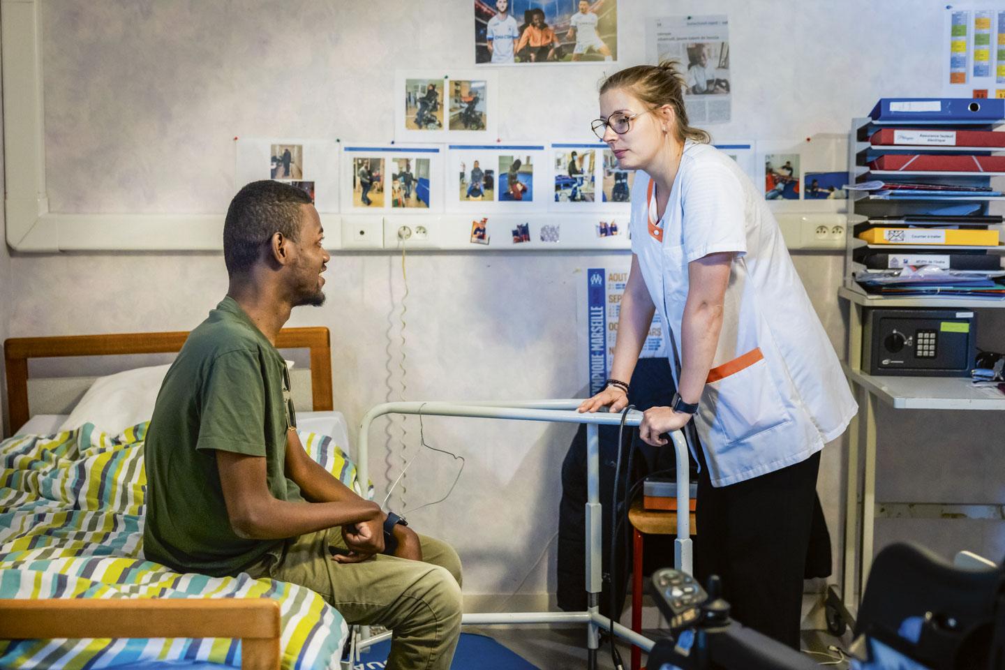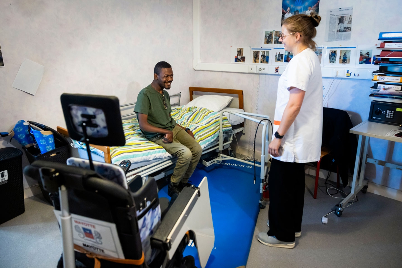 Désormais, l’établissement est en capacité d’analyser les situations de travail. Et à l’IEM, de mettre en œuvre des solutions favorisant les déplacements autonomes. « C’est parfois un travail d’essais et d'erreurs successifs. Pour Ahamadi, on a aménagé un tapis et adapté une barre fixée au lit : il peut passer seul du fauteuil au lit et s’habiller. Je n’interviens qu’à sa demande et ne prends pas le risque de me blesser », explique Françoise Davenel-Noël, une autre ergothérapeute. L’adolescent, lui, est ravi.