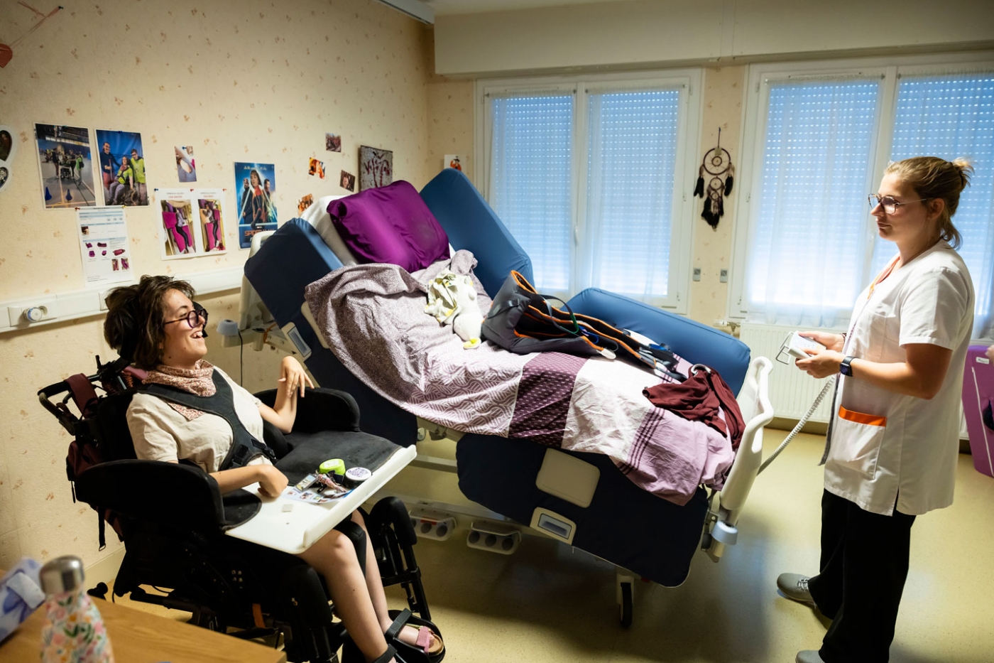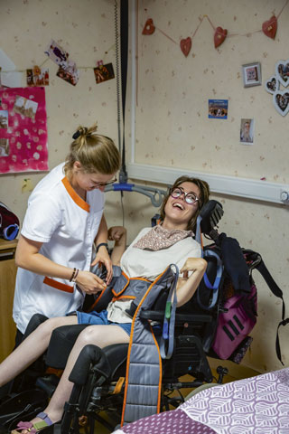 Emma, quant à elle, a très peu d’autonomie. Dans sa chambre, un lit multipositions d’aide à la latéralisation permet aux soignants, avec le rail plafonnier, d’allonger la jeune fille et de la caler de côté sur son installation de nuit faite de mousse. « Un jour où je m’étais retrouvée seule à la mettre en place, j’ai pris un bon coup de chaud », explique l’ergothérapeute. L’analyse de la situation a conduit à cet essai de lit, qui répond aussi à un souhait de la jeune fille : celui de protéger les personnes qui prennent soin d’elle.
