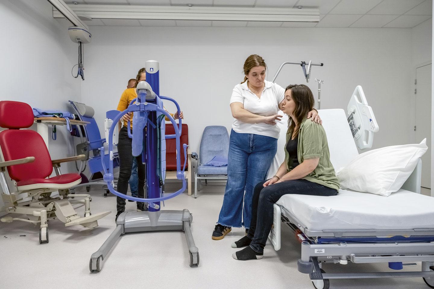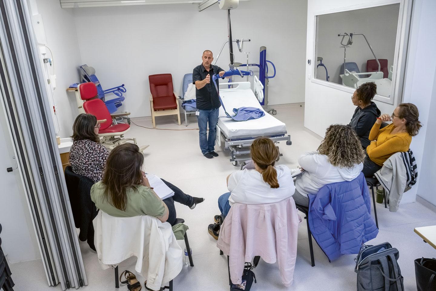 En cet après-midi de début juin 2025, six stagiaires – aide-soignante, infirmière, psychomotricienne ou encore ergonome –, sont au 3e jour du dernier module de cette formation. Les travaux pratiques consistent en des mises en situation s’appuyant sur les connaissances acquises. Les stagiaires qui endossent le rôle de patient sont discrètement briefées sur leurs capacités à se mouvoir par Cyrille Bertin, coordonnateur prévention à l’hôpital Saint-Joseph. Ainsi, celles qui enfilent le costume de soignantes construisent le déplacement dans des conditions proches du réel. Le jeu de rôle démarre. « Que voulez-vous, madame ? Aller dans votre fauteuil ? C’est d’accord. Ramenez votre jambe droite vers moi », dit la stagiaire « soignante » en tapotant sur le tibia de la stagiaire « patiente »…