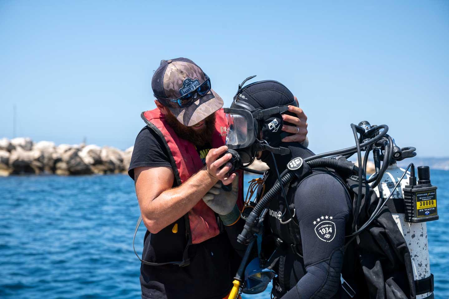 C’est à l’occasion de cette demande de dérogation que l’utilisation d’un nouveau masque facial a été proposée, permettant une liaison audio avec la surface et entre les plongeurs. « On connaissait ce masque, remarque le responsable de secteur. Mais jusqu’à présent, nous n’avions pas trop eu l’occasion de l’utiliser car en zone portuaire, il y a trop de métal et ça empêche les communications de se faire correctement. De plus, ils sont assez fragiles. » Les deux plongeurs, Charles-Gervais Clément et Yoann Reininger, s’équipent : combinaison, chaussons, bouteille, masque et batterie, ceinture de plomb, puis palmes… mais aussi un masque et un détendeur de secours.