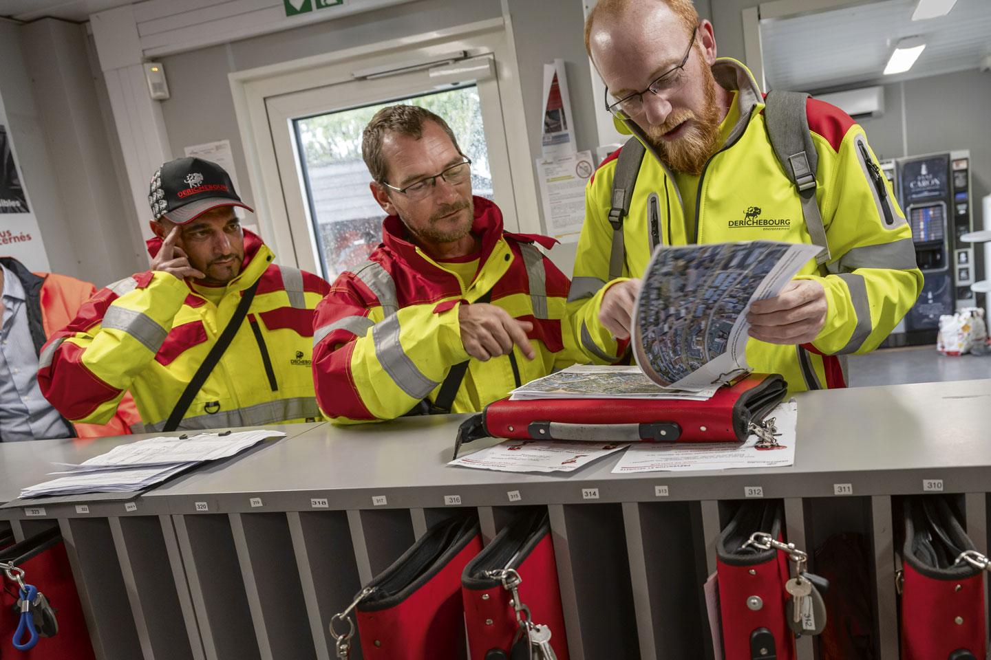 À leur prise de poste, les équipiers sont vêtus d’un ensemble « pantalon, veste et tee-shirt » jaune et rouge à haute visibilité, de gants et chaussures de sécurité. Derrière le comptoir d’accueil, les responsables de secteur s’activent pour attribuer les tournées. Gauthier Thévenot briefe Ludovic, plan à l’appui, sur les points de vigilance : « Il y a toute cette zone en travaux. Il faut que tu y passes après 17 h, quand les gars du chantier sont partis. » Ludovic acquiesce. La tournée, il la connaît bien : « On travaille souvent sur les mêmes parcours, avec les mêmes équipiers. » Ils se dirigent vers le camion de 26 tonnes qui leur a été attribué. Ludovic en fait le tour, fiche de contrôle à la main, teste le fonctionnement de la benne… tout va bien, ils embarquent.