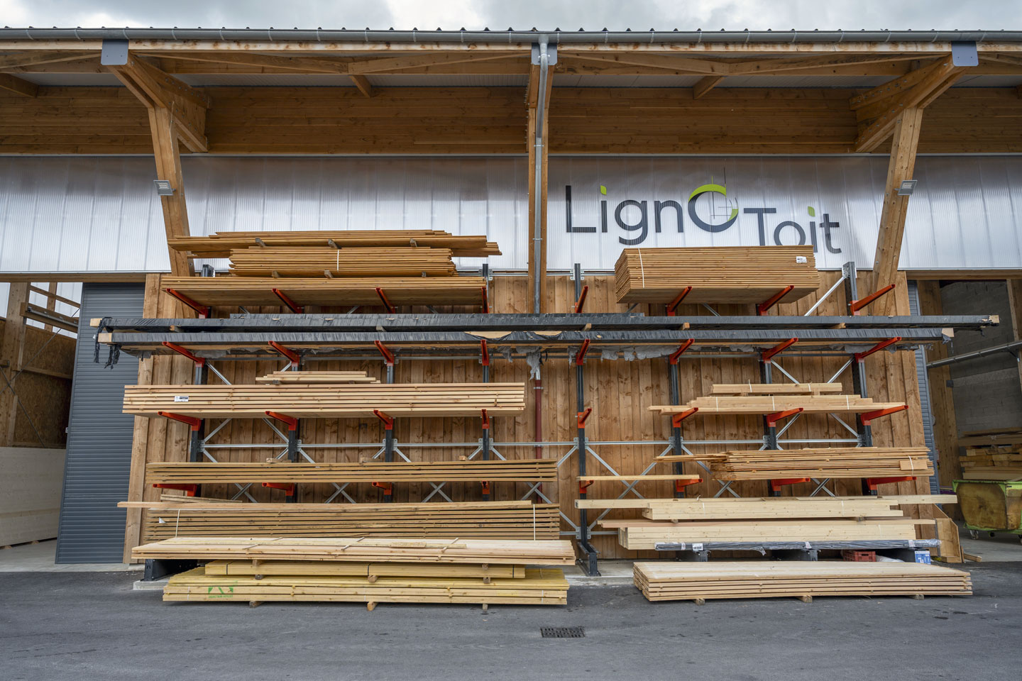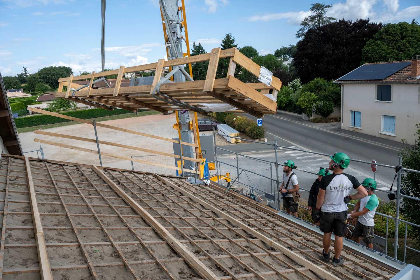 Créée en 2018 à Grièges, Lignotoit fait de la construction ossature bois, couverture, zinguerie, étanchéité en neuf ou rénovation. L’essentiel du bois utilisé est issu de forêts locales (moins de 150 km) à gestion durable. L’entreprise, devenue un acteur local incontournable de la construction bois, connaît une croissance continue. Il y a deux ans, elle a construit jusqu’à 25 maisons ossature bois. En 2025, Lignotoit a inauguré l’extension de son atelier de Grièges. Cet espace de 360 m2, doté d’importants moyens de levage et d’un système d’aspiration centralisé des poussières de bois, est réservé à la préparation des éléments pour réduire les contraintes sur les chantiers. La construction d’une maison ossature bois représente environ une semaine d’assemblage en atelier, pour moins d’une journée de levage sur chantier.