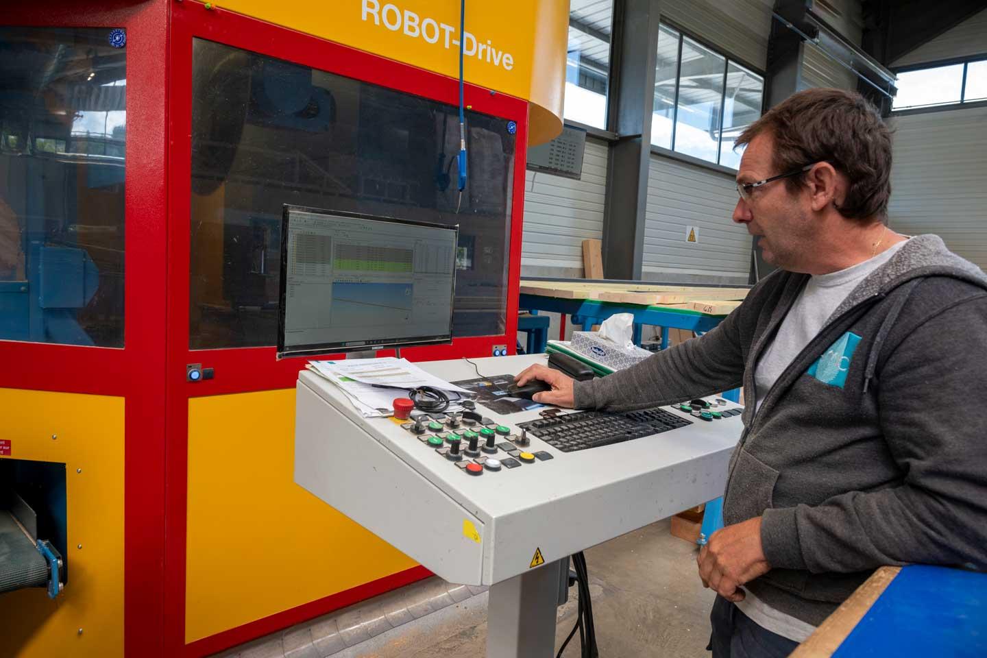 Démonstration à l’appui, il en explique le fonctionnement : il alimente le robot en barres de bois de 13 mètres de long et lance le programme établi par le bureau d’études interne. La machine effectue tous les usinages des futures pièces, change d’outillage selon les opérations à réaliser et des dimensions attendues. Une approche qui transforme le métier de charpentier. Vient ensuite dans la deuxième partie du bâtiment la table d’assemblage, installée à hauteur d’homme. Elle permet de préparer les murs préfabriqués, isolés et recouverts de bardage bois. « C’est beaucoup mieux aujourd’hui, même si on était déjà bien lotis avant, commente Clément Ponce, responsable de la préfabrication. Avec ces tables à hauteur, notre confort de travail s’en trouve amélioré. »