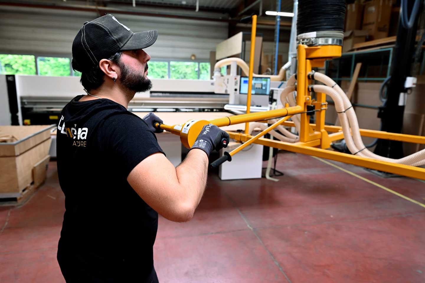 À l’époque, trois priorités se dessinent en matière de santé et de sécurité au travail : une mise à niveau de l’aspiration des poussières de bois, la gestion des solvants et la maîtrise des flux d’air aux étapes de finition (laquage et vernis), ainsi que le déploiement d’aides à la manutention pour prévenir les troubles musculosquelettiques (TMS). « L’entreprise nous a contactés en septembre 2019. Elle voulait des conseils et connaître les possibilités d’aides financières, précise Frédéric Fayard, ingénieur-conseil à la Carsat Rhône-Alpes. Le laboratoire interrégional de mesures chimiques est intervenu pour faire des préconisations sur le réseau d’aspiration des poussières de bois pour les machines fixes, les cabines de laquage et vernis, le sas de séchage des pièces et le local de stockage des produits chimiques. Un contrat d'aides a été signé pour ces installations. Dans le cadre d’un programme de construction bois, une subvention prévention a également permis de participer à l’achat d’une potence avec palonnier à ventouses, de rayonnages métalliques pour stocker des panneaux, de deux tables élévatrices, d’un transpalette électrique ainsi que la mise en place de formations. »