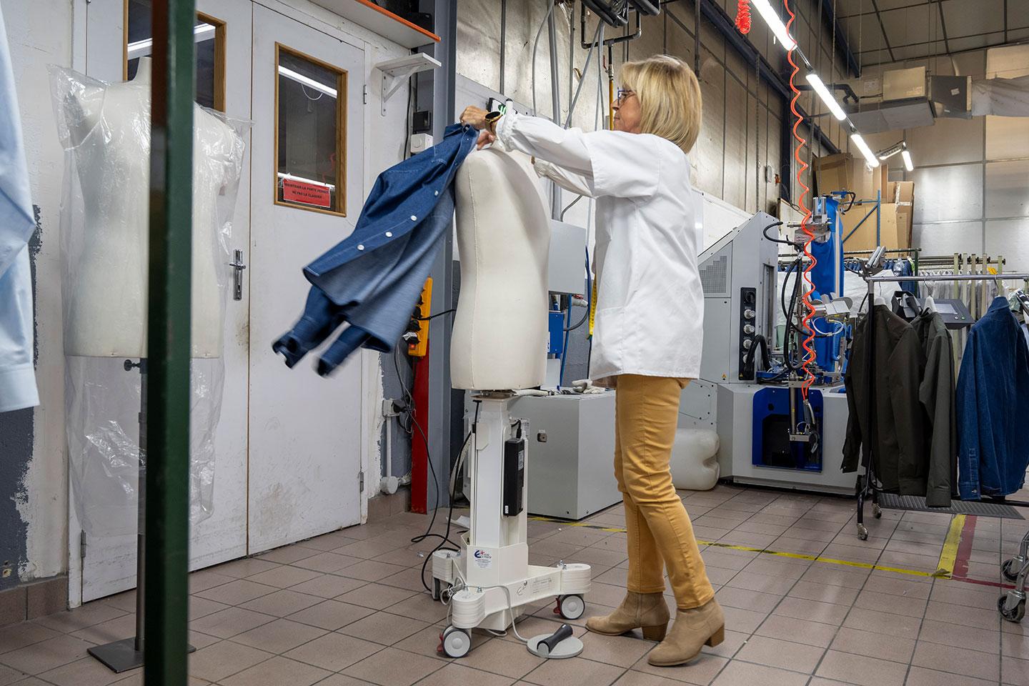 Diego du Réau a poursuivi ses recherches de solutions, en misant sur la polyvalence des personnes pour limiter leur exposition aux gestes répétitifs puis sur un mannequin gonflable, générateur de vapeur. Une sorte de robot repasseur : la chemise est enfilée sur le mannequin qui souffle de la vapeur puis de l’air tandis que l’opérateur pulvérise de l’eau. La chemise ressort parfaitement repassée, sur cintre. « C’est vraiment pratique, moins sollicitant que le repassage classique et plus rapide », explique l’un des repasseurs, qui alterne cette tache avec la finition sur une table de repassage.