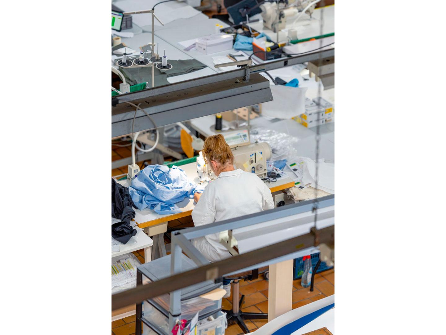 Un peu plus loin, au poste d’épluchage, une opératrice passe en revue le moindre petit fil qui dépasse. L’éclairage est intense car il est primordial. Le poste bénéficie d’une table réglable en hauteur, tout comme au piquage, et de sièges assis-debout. « Pour ce poste, nous avons sollicité un ergonome », précise Julie Deniz. À la coupe, le tissu est découpé automatiquement, à l’aide d’un robot. La couturière doit veiller à ce que le tissu soit parfaitement positionné, notamment lorsqu’il y a des motifs, et à ce que la coupe génère le moins de chutes possibles.