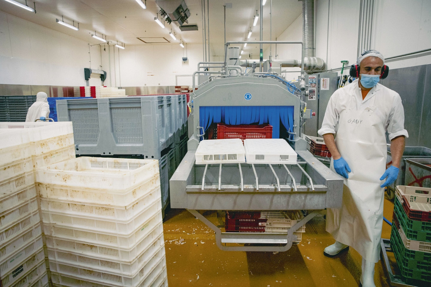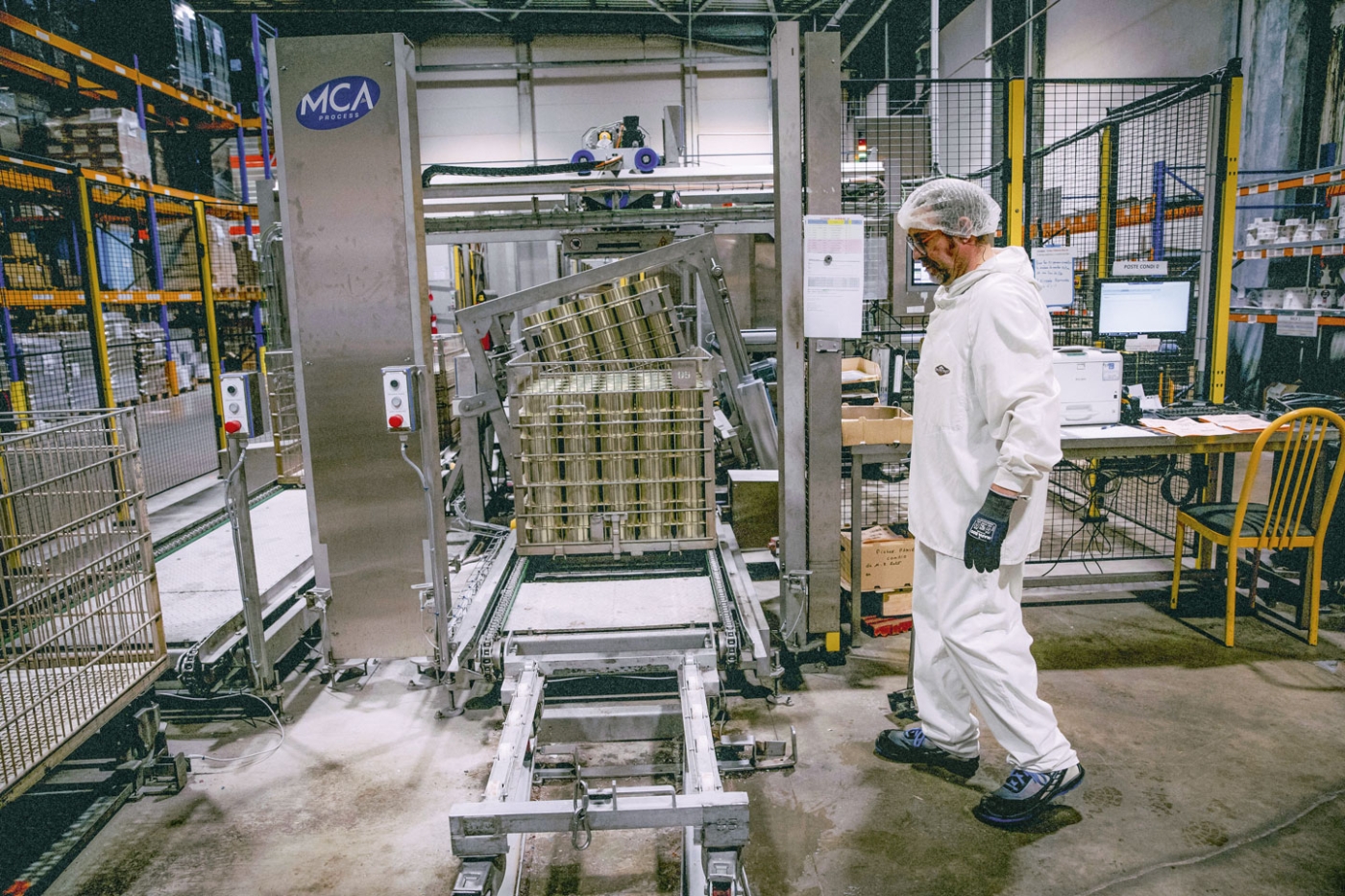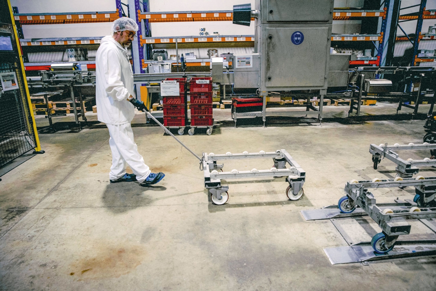 Sur la zone de conditionnement, l’action menée pour prévenir les TMS a transformé l’activité. En 2021, une première zone a été automatisée, pour vider les paniers de cuisson provenant des autoclaves et reconstituer des palettes « en blanc », qui seront étiquetées en fonction des commandes, pour coller aux besoins réels des clients. Précédemment, tout était fait manuellement et les opérateurs constituaient un stock de produits étiquetés. « Les paniers vides sont déposés sur un chariot que je récupère grâce à un bras métallique fait maison », précise François Comet, un opérateur.