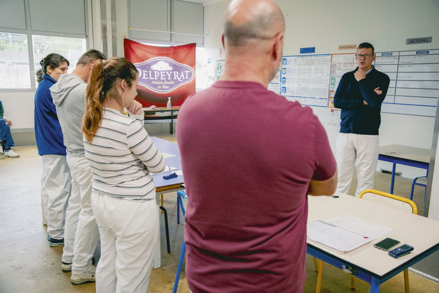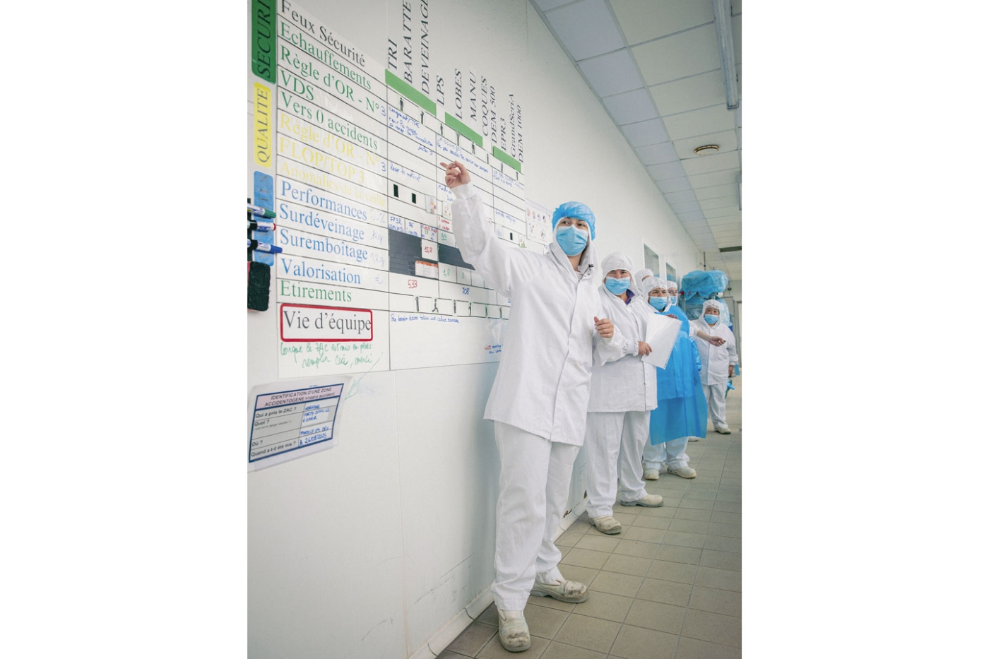 « Quelqu’un me rappelle comment on sécurise les déplacements dans l’usine ? » Il est 10 heures et Pauline Vanderstraeten, la responsable de l’atelier foie gras, lance le MVP1, première déclinaison du « management visuel de la performance » déployé sur le site. Ce rendez-vous qui réunit les collaborateurs à chaque prise de poste permet de revenir sur les événements sécurité de la veille ou du matin (une autre équipe a commencé à 4 heures), de faire des étirements, d’échanger sur la qualité et la performance de l’atelier et de rappeler les règles d’or. « On se tient à la rampe dans l’escalier », « Je me mets à l’écart des chariots en mouvement », « Je ne cours pas »… Chacun contribue à la discussion. Puis, s’appuyant sur l’activité opérationnelle, la responsable d’atelier passe des consignes. Un moment propice à la coordination d’équipe en temps réel.