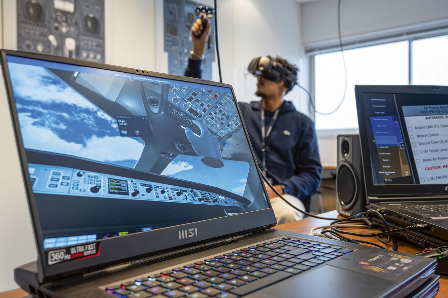 En 2018, un module de réalité virtuelle a été développé pour le Boeing 787. L’outil a ensuite été déployé, en collaboration avec Airbus, sur l’A320, l’A350 et l’A220. Chaque séquence avec le casque de réalité virtuelle dure une vingtaine de minutes durant lesquelles les stagiaires sont immergés dans le cockpit. L’instructeur valide les acquis techniques comme leurs capacités à interagir et à adopter la réaction appropriée lors de la simulation d’un problème (feu, vibrations, défaut d’un élément, fuite d’huile…).