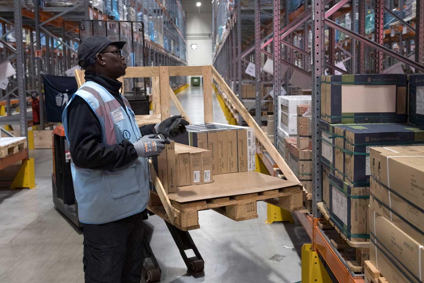 Chaque jour, 10 000 colis sont préparés : ils contiennent aussi bien des éléments de moins d’un kilo que des menuiseries ou des baignoires de plusieurs dizaines de kilos. Inmaculada Ayago Guiberteau est la responsable QSHE (qualité, hygiène, sécurité, environnement) du site depuis que ce dernier est entré dans le giron du groupe suisse. « Sur chaque site, une personne est chargée de déployer la politique QSHE du groupe », explique-t-elle. Chacune des neuf cellules accueille un type de marchandises, qui arrivent sur des racks équipés de caillebotis pour sécuriser les rangements.