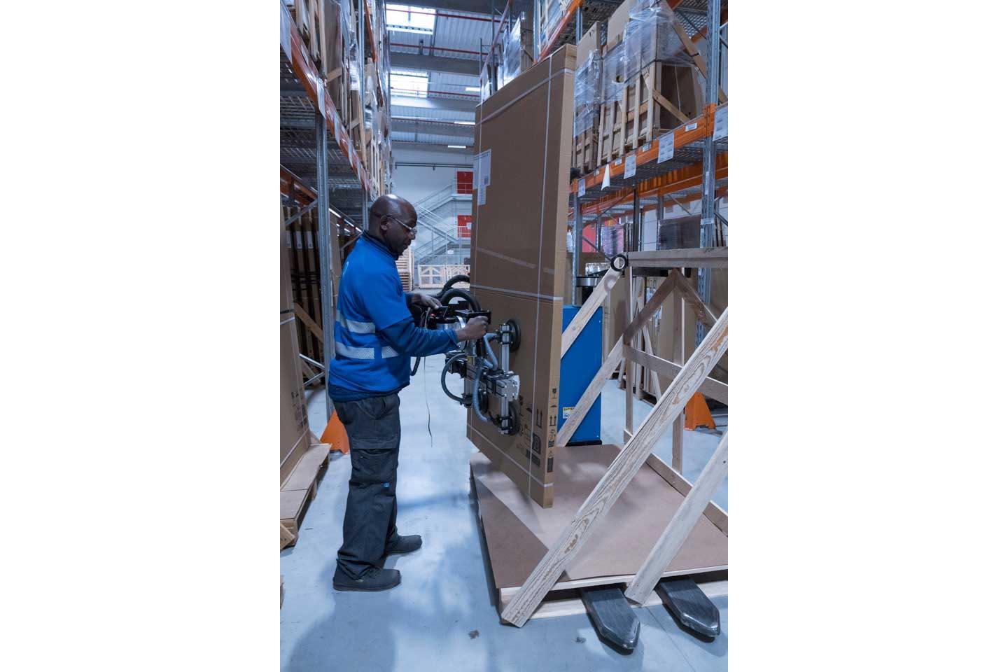 Afin de s’attaquer au port de charges, de nombreuses actions ont vu le jour. Un préhenseur mobile, développé avec un fabricant de la région nantaise, est désormais en service. Il est fixé au chariot que l’opérateur positionne devant le rack où il va récupérer, à l’aide de ses ventouses, un élément stocké verticalement, comme les fenêtres ou les receveurs de douche. Il a cependant ses limites : il ne peut être utilisé pour le carrelage ou les portes. « Si je m’en sers ? Ah oui, toute cette journée par exemple », lance Éric Penda. Avant qu’il ne soit adopté, deux modèles ont été testés par des collaborateurs. Pratique, il peut déplacer jusqu’à 80 kg.