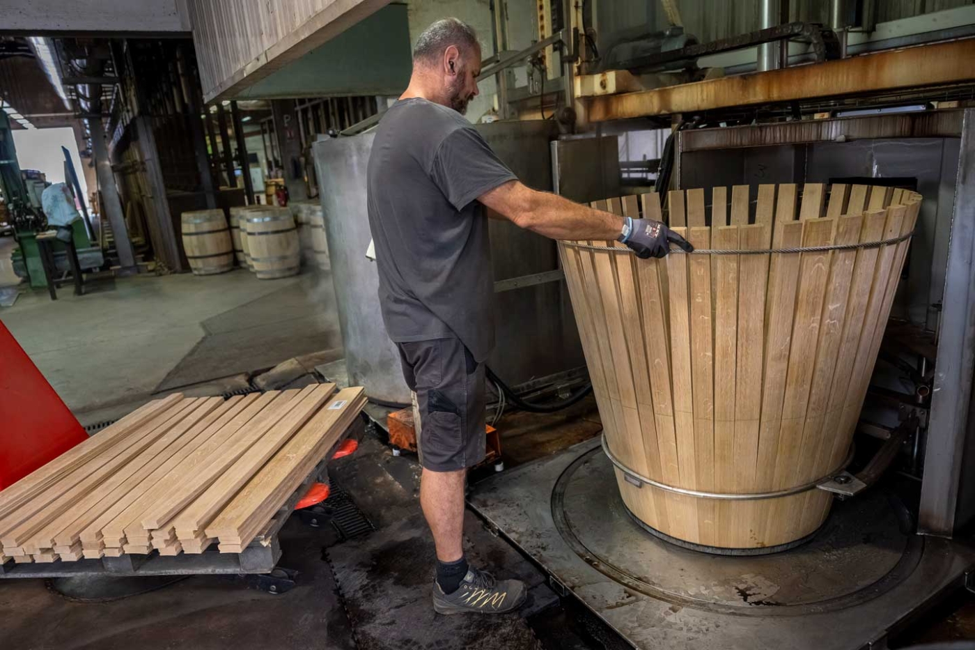 Opération suivante : la mise en rose porte bien son nom puisqu’il s’agit de former comme une sorte de fleur avec une vingtaine de douelles - ici, la mise en rose est dite inversée, pour réduire les gestes contraignants. Pour assouplir les futures barriques et faciliter le cintrage, une cloche envoie de la vapeur à basse pression à l’intérieur. Un cabestan (un câble pour maintenir la forme du tonneau) permet de commencer le cintrage temporaire. « Cela évite une première chauffe aurait exposé les salariés à des benzo[a]pyrènes », commente Clément Genty.
