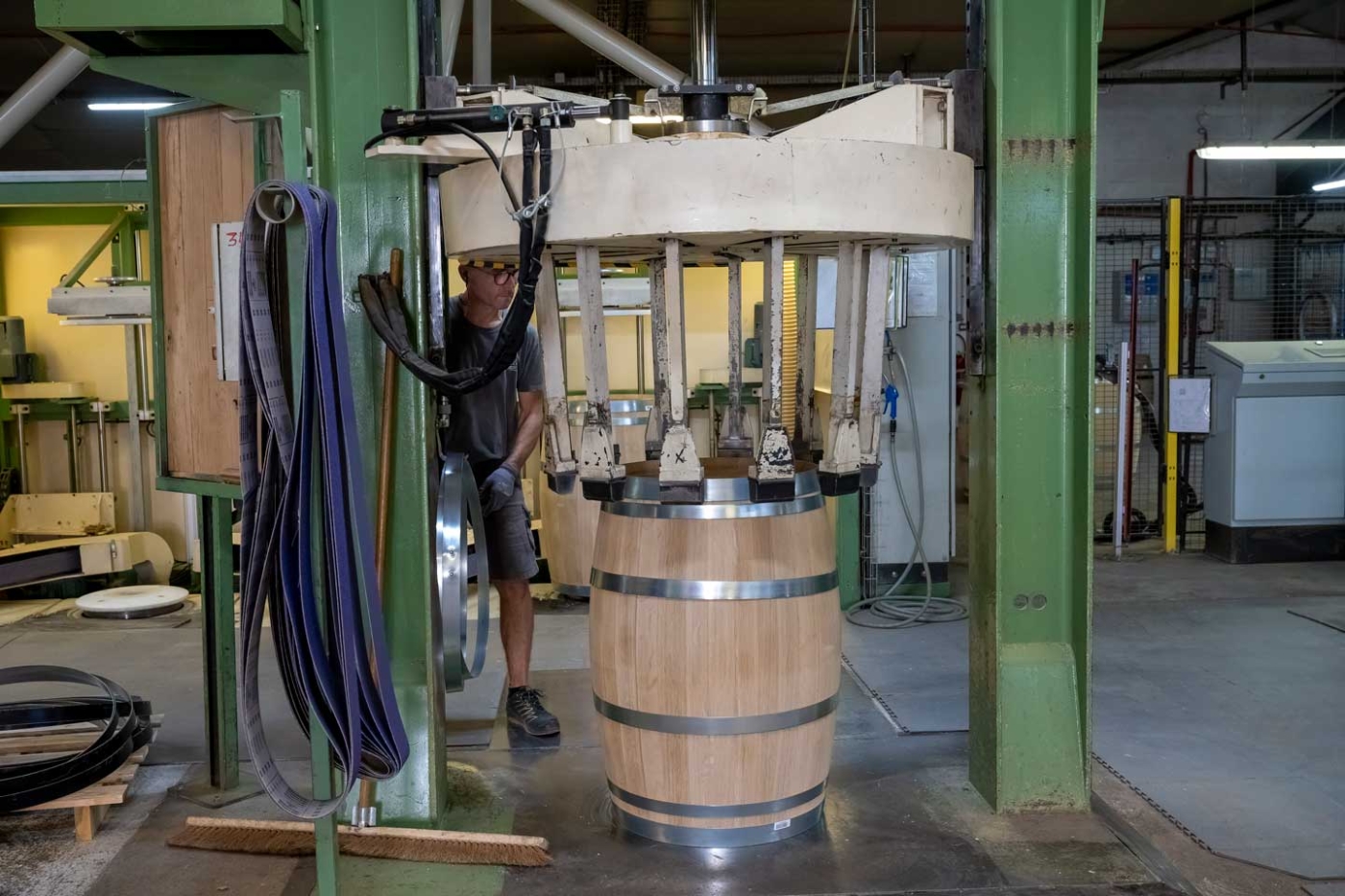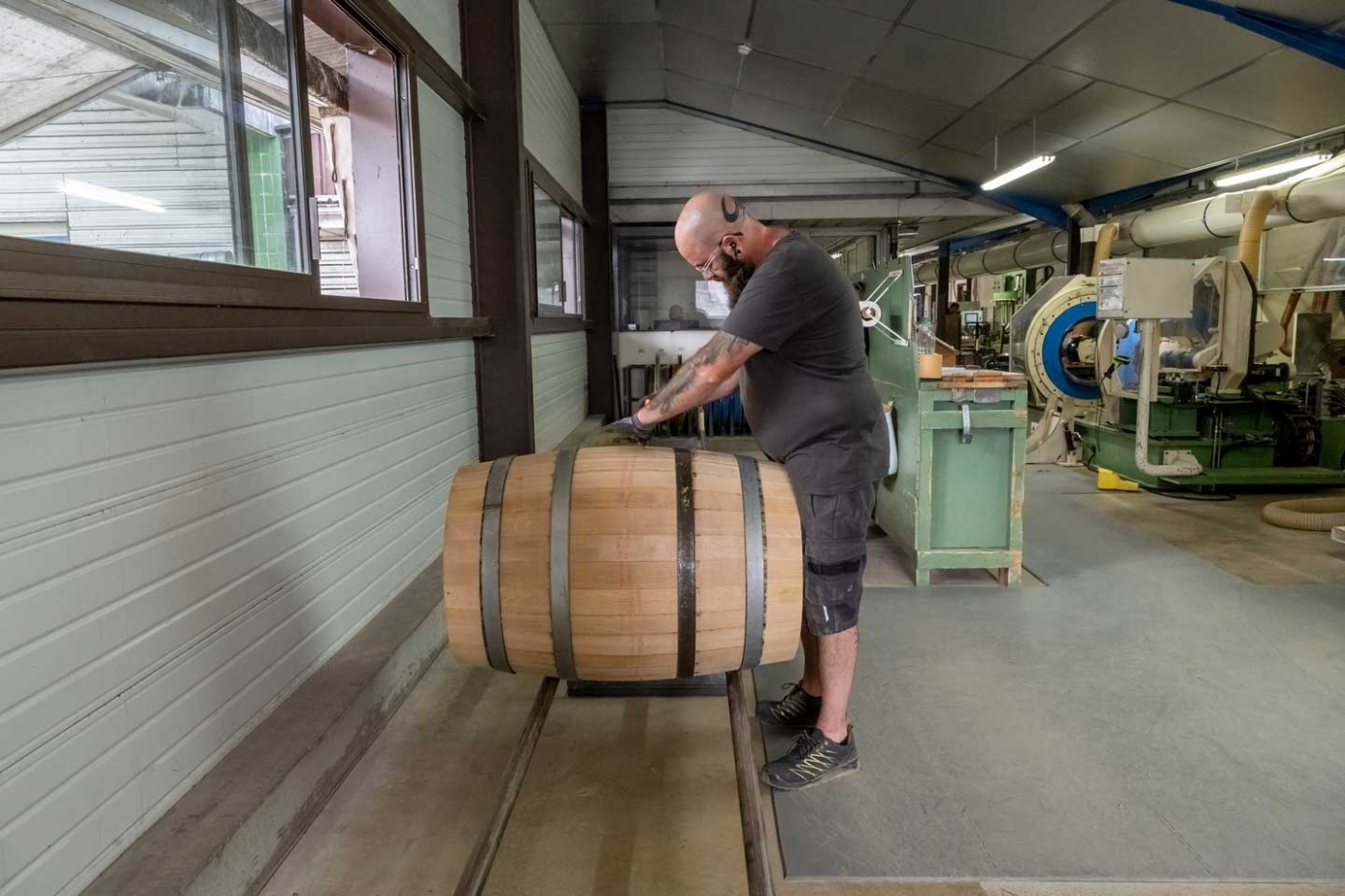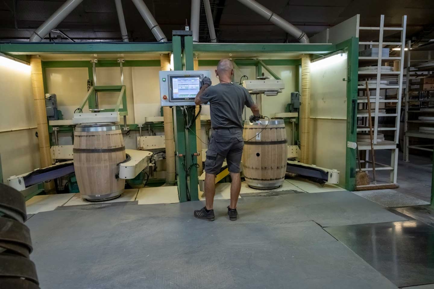 Les barriques ayant pris leur forme quasi définitive, elles sont déplacées par gravité vers un autre bâtiment, situé légèrement en contrebas. Là, le cerclage provisoire est enlevé, le fond inséré. « Sur ce poste, comme sur cinq ou six autres, nous avons testé des exosquelettes, explique Clément Genty. Mais à chaque fois, ils n’ont pas été retenus par les opérateurs, car ils généraient plus de contraintes que de bénéfices. » « Nous sommes régulièrement consultés, complète Damien Lozingue, membre du CSE. On procède aussi régulièrement à des visites d’ateliers et une boîte à idées est à disposition, pour faire remonter des difficultés ou des idées. » Les barriques sont ensuite poncées mécaniquement dans des cabines, avec aspiration à la source.