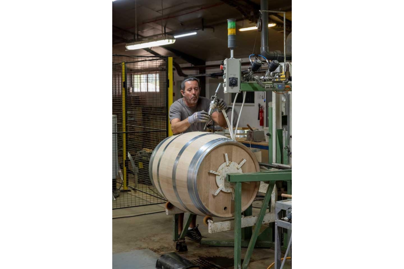Puis vient la chauffe des barriques, une étape très importante pour développer leur potentiel organoleptique. 60 foyers en tout – de type braseros – sont en activité : une vis sans fin apporte les pellets qui alimentent en continu la flamme. La cuisson dite moléculaire s’effectue grâce à un brasero recouvert d’un double cône métallique qui emprisonne la flamme. La barrique repose sur un plateau rotatif et est traversée par ce double cône, luimême relié à un caisson qui enveloppe l’ensemble. La barrique est chauffée par le rayonnement indirect du cône, tandis qu’une sonde infrarouge mesure la température de la coque. Piloté par un système informatique, un ventilateur s’active à l’intérieur du caisson selon les besoins afin de réguler le cycle thermique.