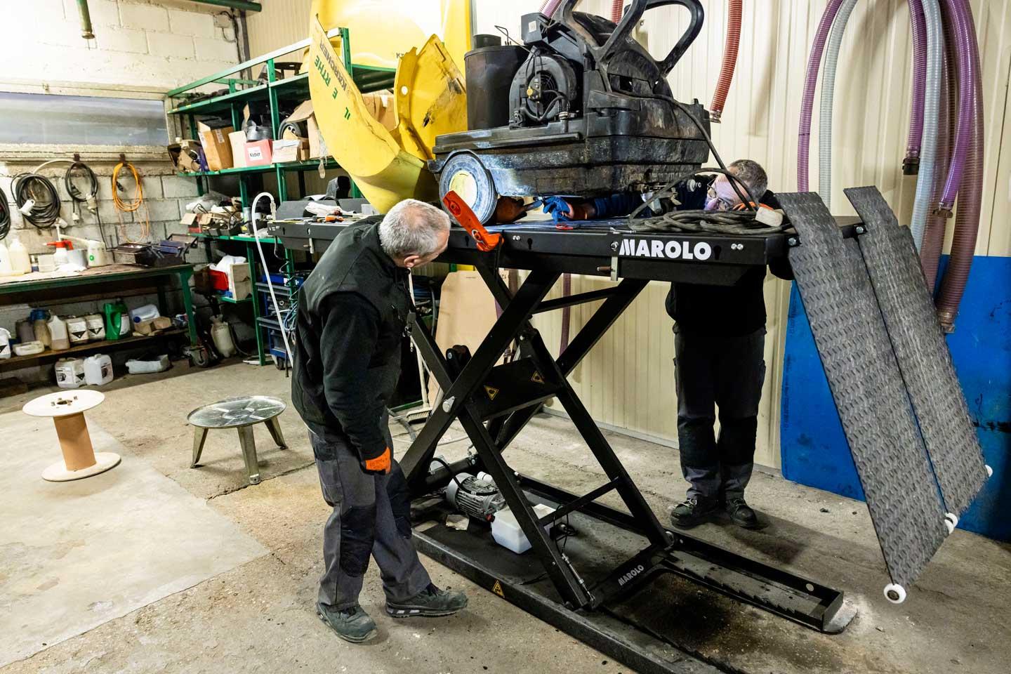« C’en est fini de travailler courbé, à quatre pattes ou couché au sol », s’exclame Christophe Loiseau, technicien vinicole, en positionnant la table élévatrice à la hauteur souhaitée pour accéder sous le nettoyeur haute pression sans se baisser. « Elle est modulable, c’est-à-dire qu’on peut écarter certains éléments pour accéder facilement là où il faut », complète Patrick Rochereux, son collègue. « La demande venait d’eux et des difficultés qu’ils remontaient », intervient Alice Chamon. Mis à disposition à l’hiver 2024, l’équipement fait l’unanimité.