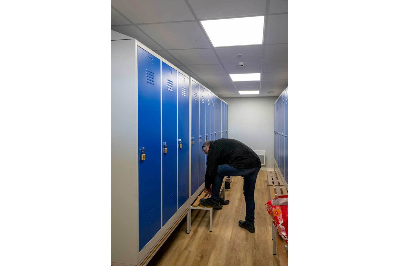 Les locaux sociaux sont composés d’une salle à manger donnant sur un « baladoire », sorte de grande terrasse couverte – un peu à l’image d’une coursive de bateau – permettant aux salariés de prendre un café ou de faire une pause. « Je vais compléter son aménagement en dessinant des meubles afin de le rendre plus agréable et convivial », précise l’architecte. Juste à côté, les vestiaires, hommes et femmes, sont vastes, dotés de douches et de toilettes ainsi que de casiers individuels doubles, avec d’un côté un espace pour les affaires propres et un autre pour les sales, dont le nettoyage est pris en charge par l’entreprise. Des bancs rétractables, pour libérer de la place sans qu’ils puissent être emportés ou délocalisés dans d’autres locaux, se glissent aisément sous les casiers. Ces derniers sont surmontés d’une coiffe, pour que rien ne puisse être entreposé à cet endroit.