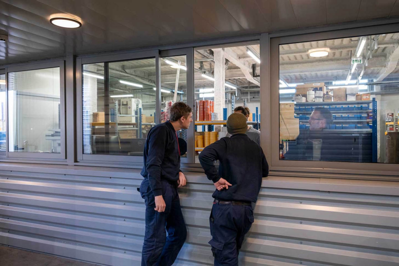 La maintenance n’a pas été oubliée. « C’est une véritable entreprise dans l’entreprise », estime Jean-Christophe Sollari. Des garde-corps ont été mis en périphérie des zones d’intervention de l’équipe maintenance, et toute la machinerie est accessible depuis un escalier qui débouche sur une sorte de terrasse intérieure à laquelle seuls les opérateurs de maintenance ont accès. Ils peuvent ainsi intervenir avec leur matériel et travailler sans position contraignante. Pas très loin, au-dessus des magasins et des ateliers, une mezzanine est équipée d’une barrière écluse pour protéger l’opérateur lors des gerbages.