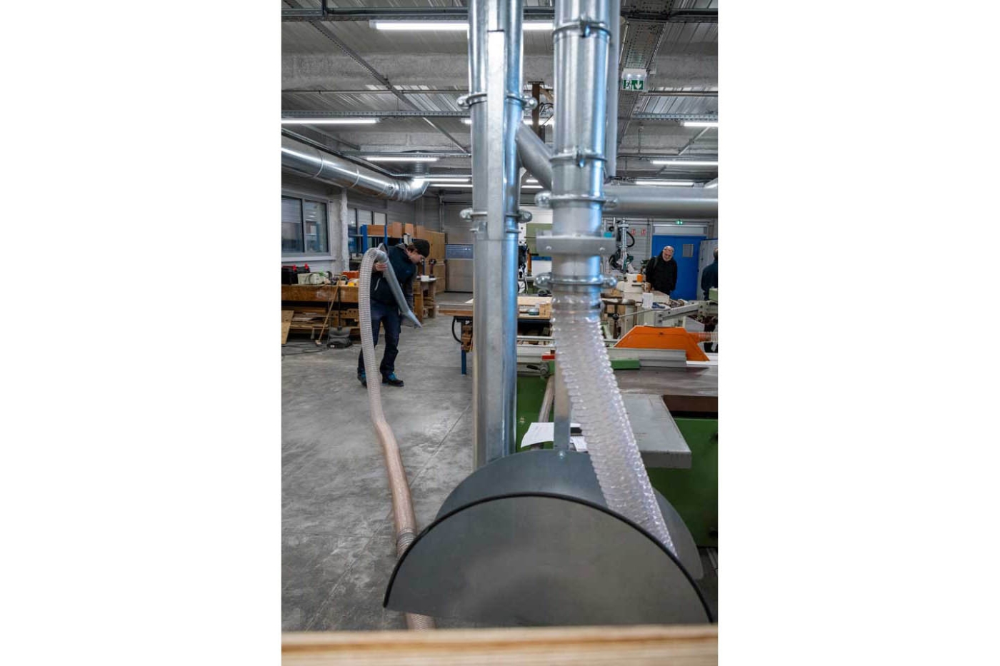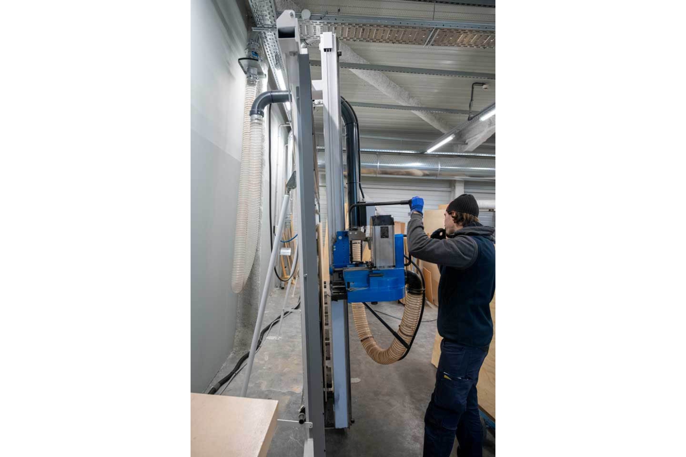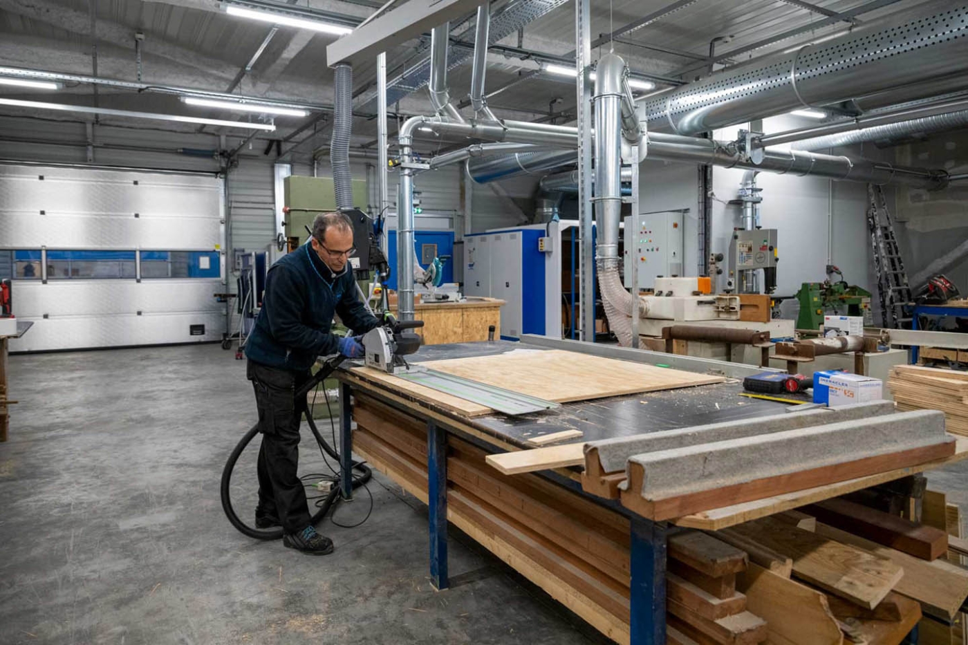 Toutes les machines bénéficient d’une aspiration asservie au fonctionnement de ces dernières – basse pression pour les machines fixes, et haute dépression pour les machines électroportatives. La toute nouvelle scie à panneaux était attendue car elle permet de découper toutes les grandes planches placées dès le début des opérations sur les yachts. Destinées au cheminement sur les bateaux, elles sont indispensables aux équipes de MB92 pour préserver les lieux d’intervention. Un réseau de nettoyage permet d’aspirer les moindres recoins de l’atelier, et une potence multi-énergie s’avère bien pratique pour pouvoir brancher les équipements électroportatifs. Pour l’heure, s’ils ne sont que deux à travailler dans la menuiserie, ils espèrent bien étoffer l’équipe. « Tout est prêt pour accueillir de nouveaux salariés », remarque le chef d’équipe.