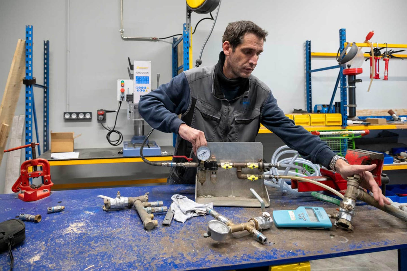 Dans les autres ateliers comme la plomberie, la lumière arrive en deuxième jour, via l’allée principale. Des leds puissantes procurent l’éclairage adapté à l’activité, sans lumière bleue. Là aussi, un réseau de ventilation et un traitement acoustique sont opérationnels. L’atelier composite est le dernier encore en cours d’installation. Mais, de l’avis de tous, les matières premières utilisées et les différents process – résine, catalyseur, poudre de silicium, notamment – pouvaient être sources de risques. Il a donc été décidé d’isoler les opérations de pesage et de mélange afin d’y mettre une ventilation, ainsi qu’un stock de produits chimiques avec une fosse de rétention dans le dallage.