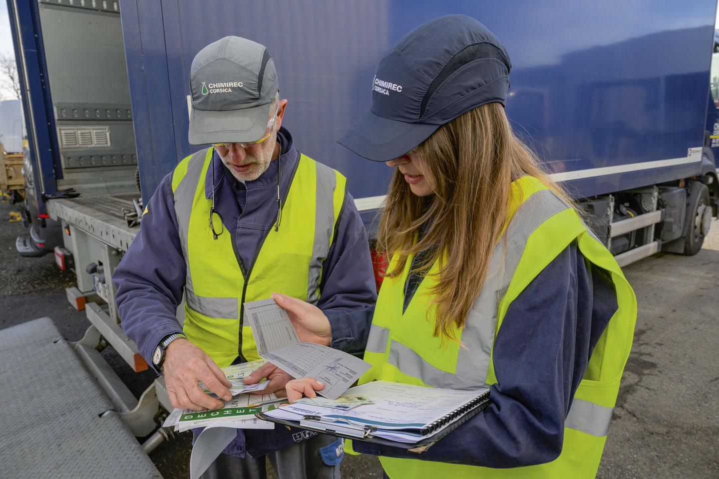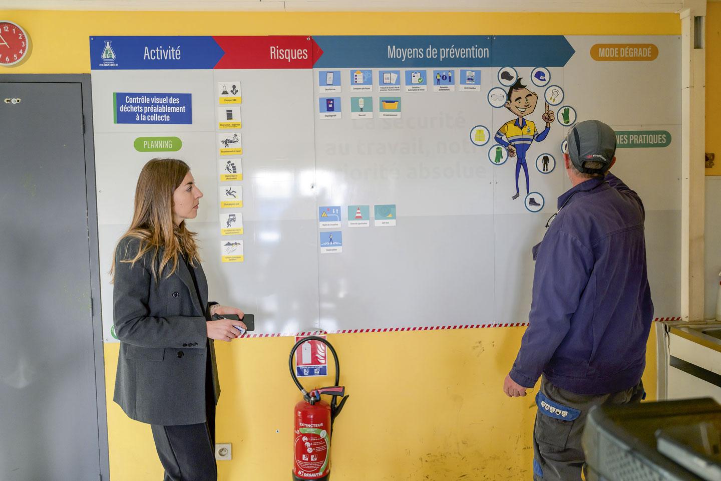 Avant de partir en tournée, Anne Busson, responsable d’exploitation, procède, comme toutes les semaines, à un « préjob briefing » de Xavier. Sous l’oeil attentif de Prescilla, il est mis en situation : « Je te propose un contrôle des déchets à collecter, ça te va ? », lui demande Anne Busson. Xavier doit décrire son activité, les risques associés, les moyens de prévention et les équipements de protection individuelle (EPI). La discussion s’engage, Xavier positionne les pictos sur un tableau blanc. Chutes d’objets, encombrement, CMR (cancérogènes, mutagènes ou toxiques pour la reproduction)… Règles de circulation, étiquetage ADR - l'accord européen relatif au transport international des marchandises dangereuses par route… les réponses fusent. « On a l’impression que c’est une activité sans risque, et finalement, il y en a pas mal », conclut Anne. Tandis que Prescilla part enfiler ses vêtements de travail et récupérer ses EPI, Xavier vérifie qu’il a bien les cale-roues de son camion. « Obligatoires, même en cas de sol plat. C’est la règle chez Chimirec », commente Michel Koutcherawy, le directeur du site, présent également à ce briefing. Direction une concession Mercedes de Bastia. Tout au long du trajet, Prescilla observe la conduite de Xavier. Rien à signaler.