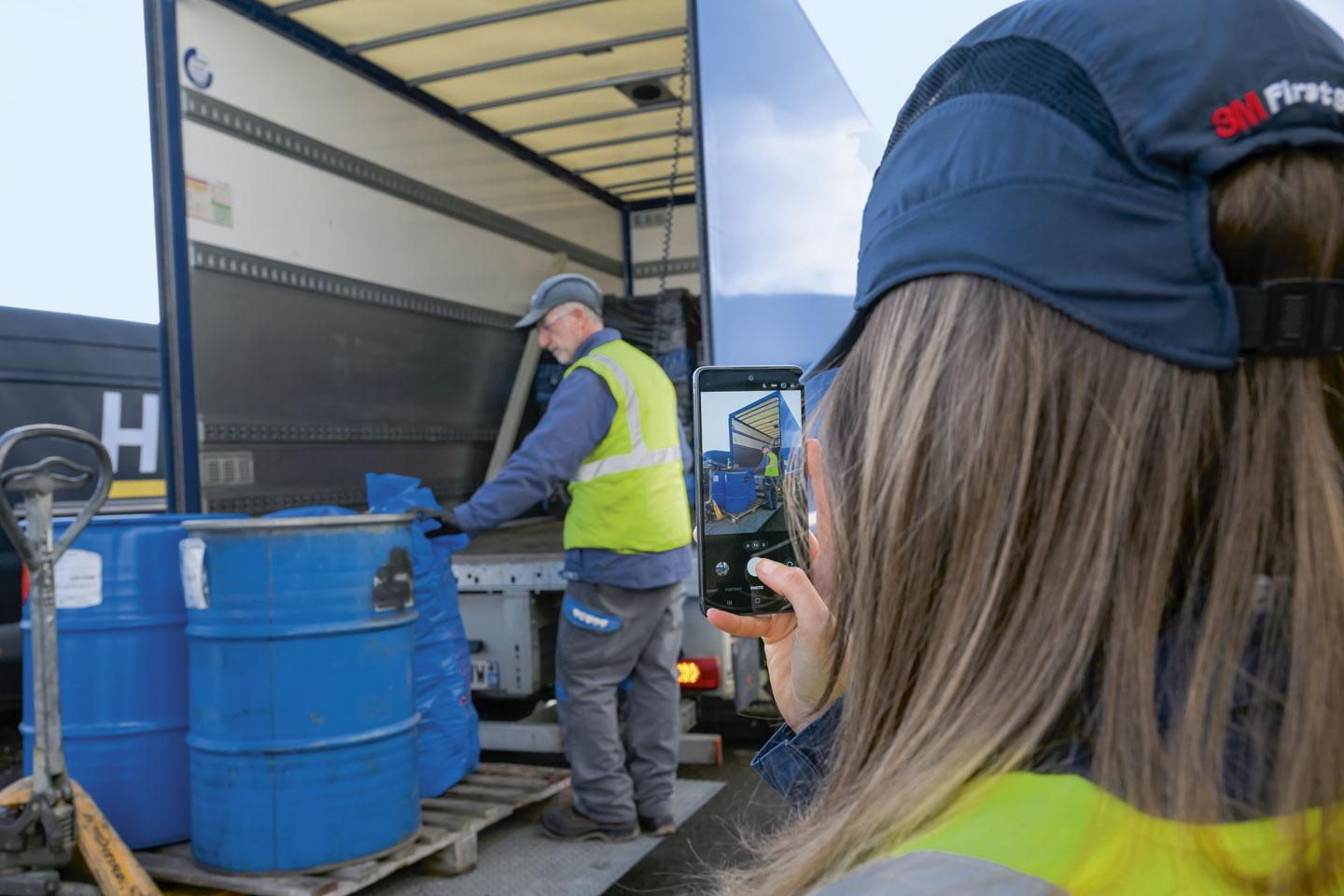 Arrivé chez le client, Xavier se présente au chef d’atelier. De son côté, Prescilla contrôle l’ensemble des documents du chauffeur : permis, carte de qualification, ADR, les Caces… Tout est en règle. Xavier déploie le hayon, puis descend trois fûts vides ainsi qu’une sache - sac plastique particulièrement solide - de 330 l, sur lesquels il colle les étiquettes de danger. Pour déplacer les fûts, il dispose d’un lève-fût et d’un transpalette manuel. Il charge dans le 16 tonnes deux fûts remplis de filtres à huile et d’aérosols ainsi qu’une sache pleine de bidons d’huiles vides. Prescilla suit ses moindres gestes, remplit son formulaire et prend des photos. Une fois les bidons sanglés et arrimés, Xavier s’exclame, tout en dépliant à l’avant et à l’arrière de son camion la plaque orange qui signifie qu’il transporte des déchets dangereux : « On passe à l’administratif, pas la chose la plus facile ! »