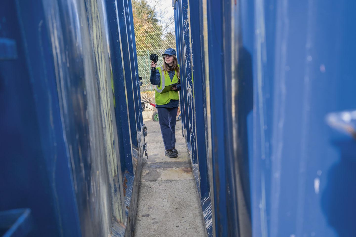 Prescilla remet sa tenue de travail pour procéder au tour du site de 12 477 m2 et relever la température des déchets dangereux ou susceptibles de s’enflammer. Une opération qui doit être réalisée trois fois par jour. « Nous sommes en janvier, il y a assez peu de départs de feu, mais en été, la température peut vite grimper, on surveille ça de très près. » Elle commence par le contenant de la déchetterie destiné aux piles et petites batteries. « En été, nous le mettons à l’ombre, et en 2026, nous allons construire une ombrière pour protéger les salariés et mettre à l’ombre ces déchets. » 16,8 °C. Tout va bien. « Si la température monte 20 °C au-dessus de la température extérieure, nous arrosons, et nous contrôlons la température deux heures après. » Benne de déchets verts : 20 °C. La prise de température, sur les quatre faces de la benne, se fait à l’aide d’une caméra que la jeune femme déplace pour chercher le point le plus chaud. En 2026, le site va s’équiper d’une détection incendie afin de faciliter la surveillance la nuit. Puis elle se dirige vers les bennes en instance de départ. Insularité oblige, tous les déchets récoltés vont sur le continent. Mais le directeur a pour projet de créer une installation pour prétraiter les eaux hydrocarburées et réduire de plus de 80 % les déchets liquides envoyés de l’autre côté de la Méditerranée. Bennes d’emballages métalliques et plastiques souillés, bennes de filtres à huile… Les températures n’excèdent pas les 28 °C. « Elles peuvent dépasser les 70 °C en période estivale », commente Prescilla. Elle vérifie ensuite les accès aux moyens d’extinction, le rangement et l’accès à une zone tampon. On passe ensuite aux alvéoles dans lesquelles sont rangées d’autres types de déchets (inflammables, bases, acides, zone prison – grillagée pour les déchets non identifiés –, aérosols, toxiques)… pas d’échauffements là non plus.