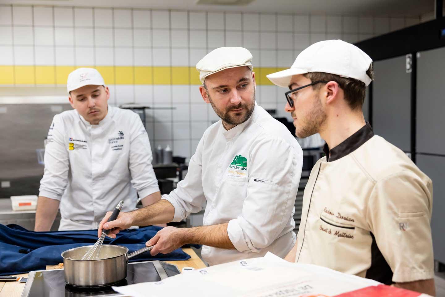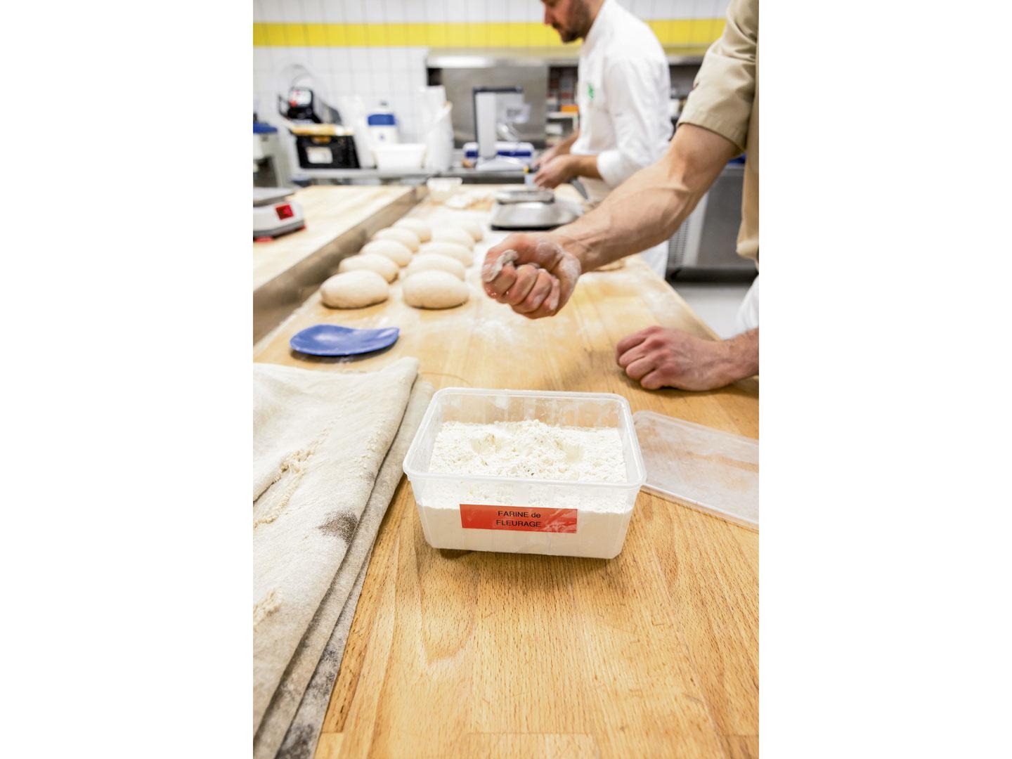 Mais aujourd’hui, cinq apprentis, en brevet de maîtrise, s’apprêtent à pousser l’expérimentation plus loin. Sous le regard de Thierry Muths, responsable de l’enseignement, Laurent Mercatoris, ingénieur de prévention à l’ACST - Association de conseil en santé au travail, le service de prévention et de santé au travail qui suit l’établissement, et de Thomas Wendling, boulanger-conseil au moulin de Sarralbe, distributeur local de la farine à faible IP, ils se lancent dans la réalisation de recettes inédites : un pain complet et une baguette tradition en utilisant une farine à faible IP, non plus seulement pour le fleurage, mais aussi pour la panification. Parmi eux, Yanis Leibel, 22 ans, déjà titulaire d’un CAP de boulanger et de pâtissier, et d’un brevet professionnel en boulangerie, porte un masque FFP3 : « Il y a un an, j’ai commencé à développer une allergie à la farine. D’abord le nez qui coule, des éternuements… Et maintenant, j’ai un traitement contre l’asthme. Cela m’intéresse donc d’autant plus de voir ce qu’on peut faire avec ces farines à faible IP. »