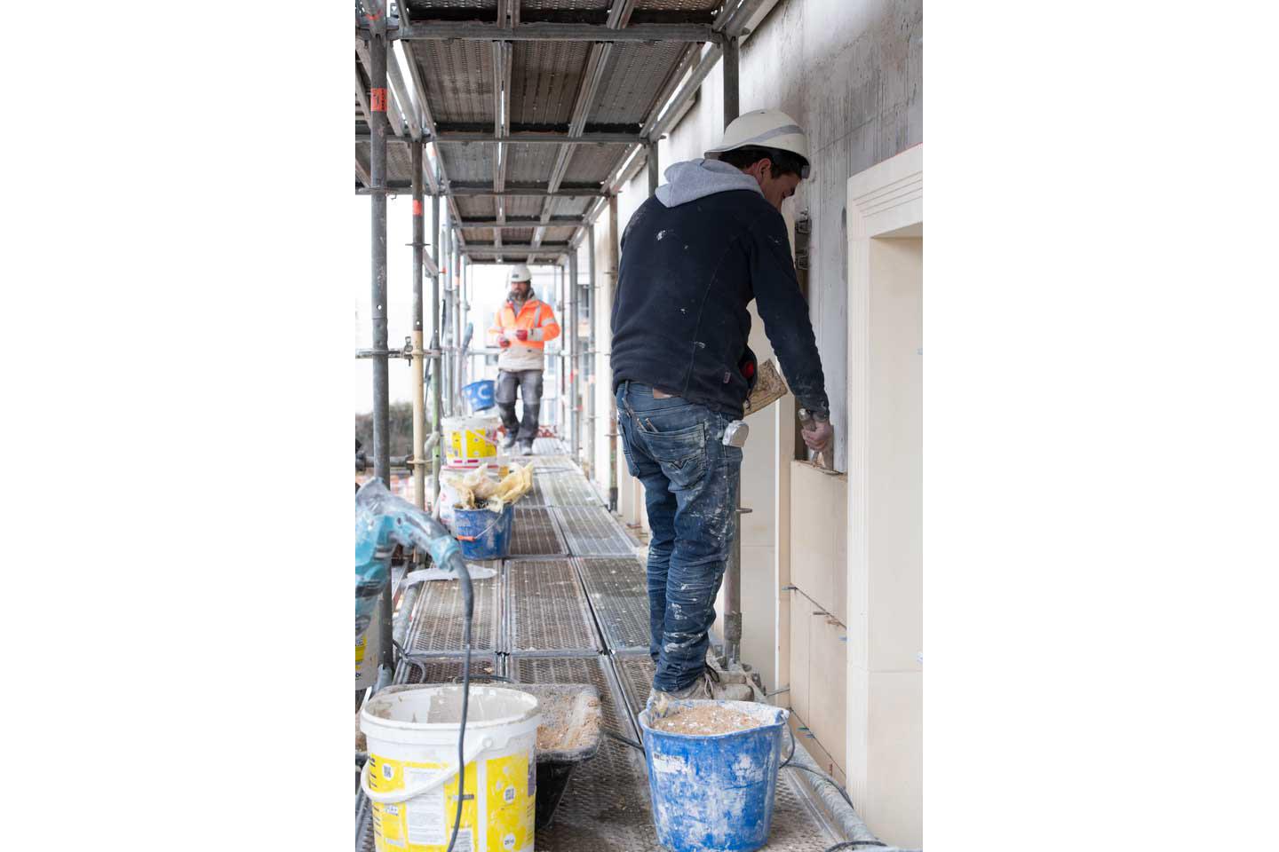 Dans les étages, un plaquiste emprunte l’ascenseur de chantier pour évacuer des plaques de placo. « Tout le personnel a été formé à l’utilisation de l’ascenseur de chantier, et des rappels réguliers sont utiles sur le terrain », observe Arthur Gros, pilote de travaux chez Eixa. À un étage inférieur, les tailleurs de pierre qui sont à l’œuvre peuvent travailler au plus près du mur, sans contrainte posturale. La présence d’escaliers facilite leurs déplacements et les manutentions de petit matériel. De l’aveu de l’échafaudeur, cela reste complexe de satisfaire tout le monde. « Si l’écart vis-à-vis des façades est relativement bien géré, une des complexités est l’altimétrie des planchers », précise-t-il.